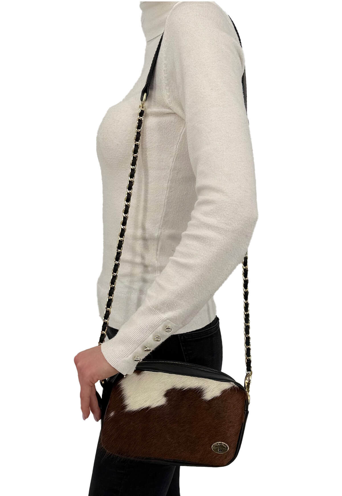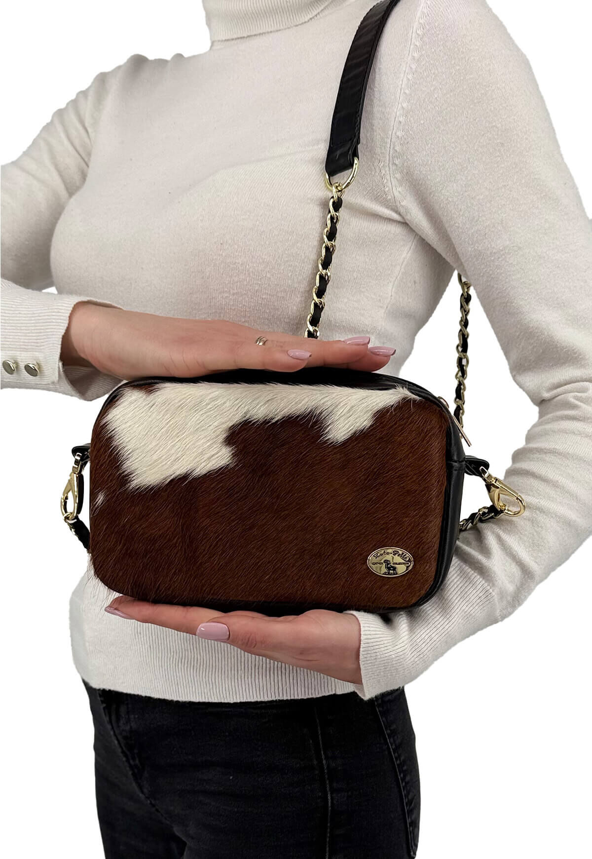 Entdecken Sie unsere stilvolle Damen Umhängetasche, die aus hochwertigem Leder und einzigartigem Kuhfell gefertigt ist. Jede Tasche ist ein Unikat und besticht durch ihr individuelles Design, das Ihrem Outfit eine besondere Note verleiht.