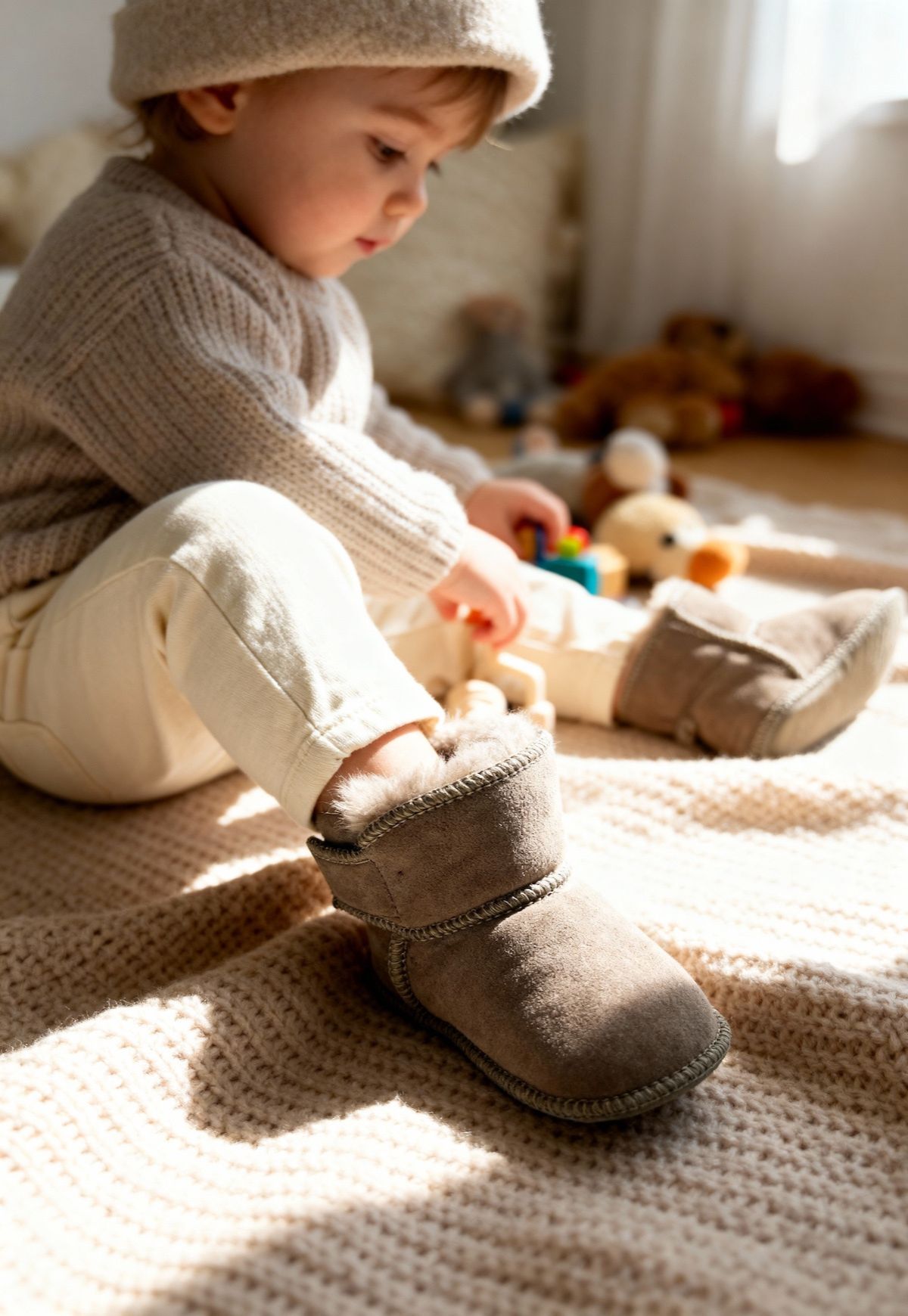 Gefertigt aus kuschelig weichem Merino-Lammfell und anschmiegsamem, butterweichem Echtleder, bieten diese Schuhe höchsten Tragekomfort und schützen die zarten Babyfüße auf natürliche Weise. Sie fördern ein gesundes Wachstum und schenken deinem Kind ein Gefühl von Geborgenheit bei jedem Schritt.