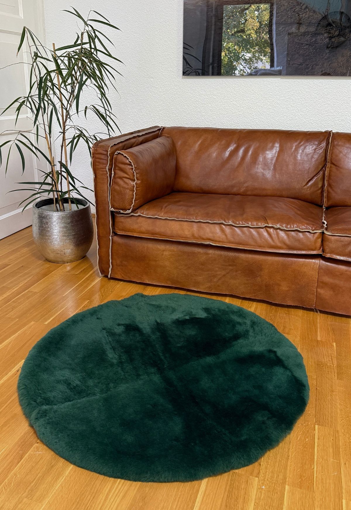 Kauf auf Rechnung möglichBeschreibungRunder Merino-Schaffell-Teppich in edlem Grün – Ø 90 cm