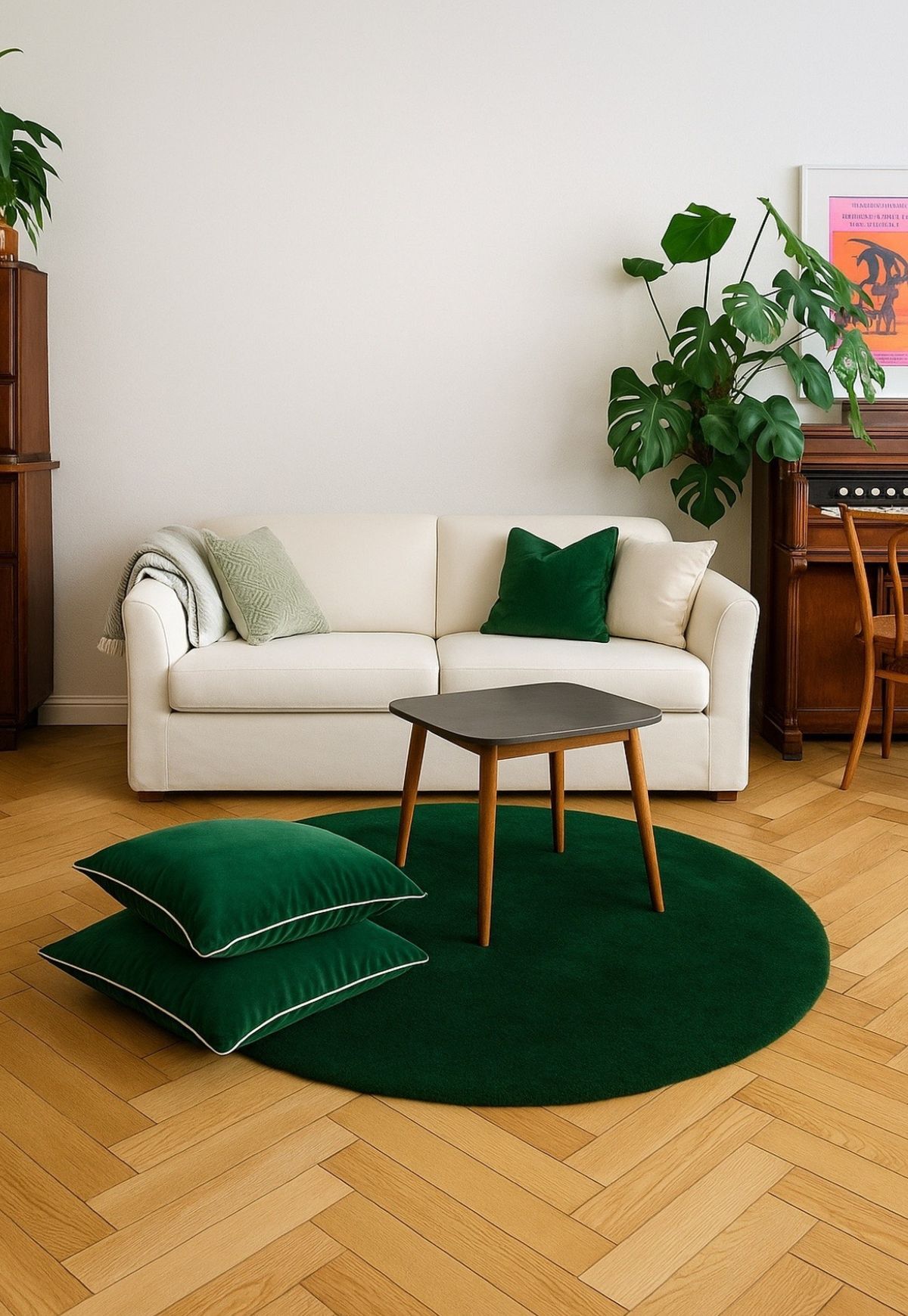 Mit seiner intensiven grünen Farbgebung wird dieser Teppich zum edlen Interior-Accessoire, das jedem Raum eine warme und zugleich moderne Note verleiht.