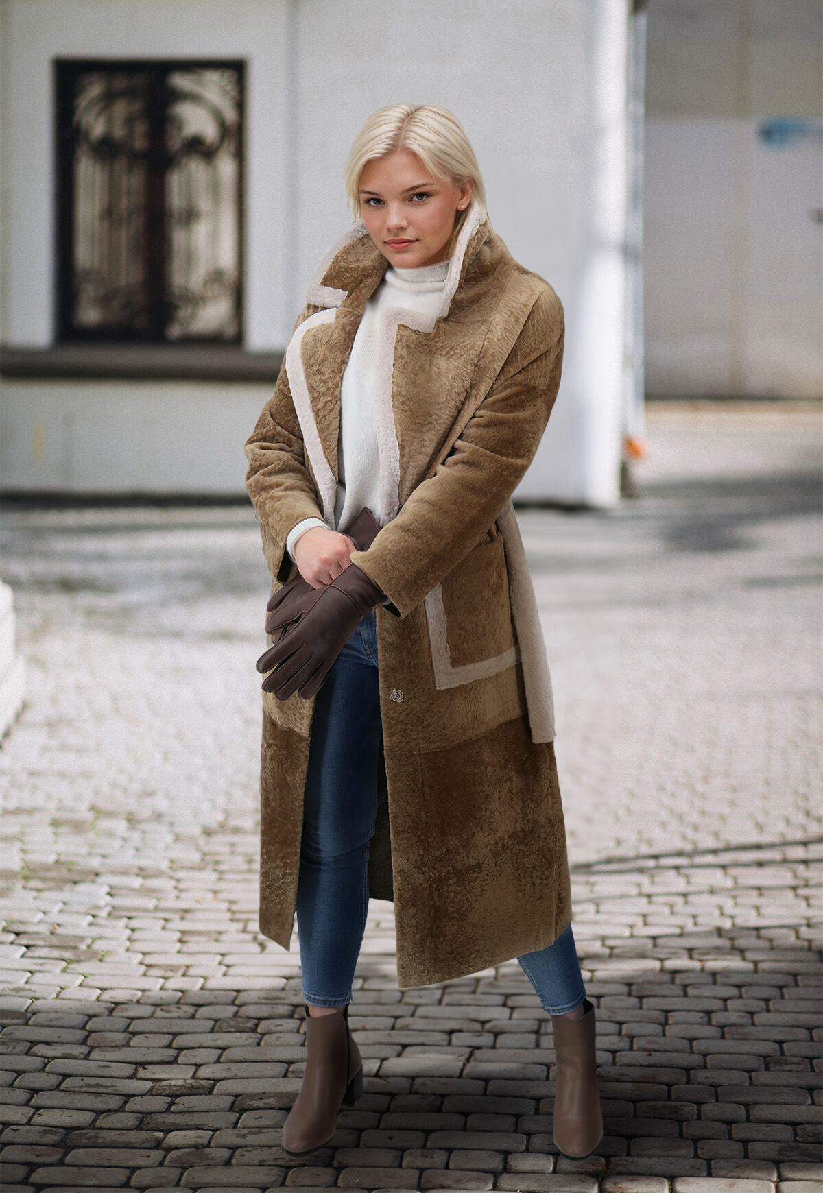 Kauf auf Rechnung möglichBeschreibung- Stylischer Damen Mantel in Hellbraun Creme, aus kuscheligem Shearling hält auch an kühlen Tagen wunderbar warm