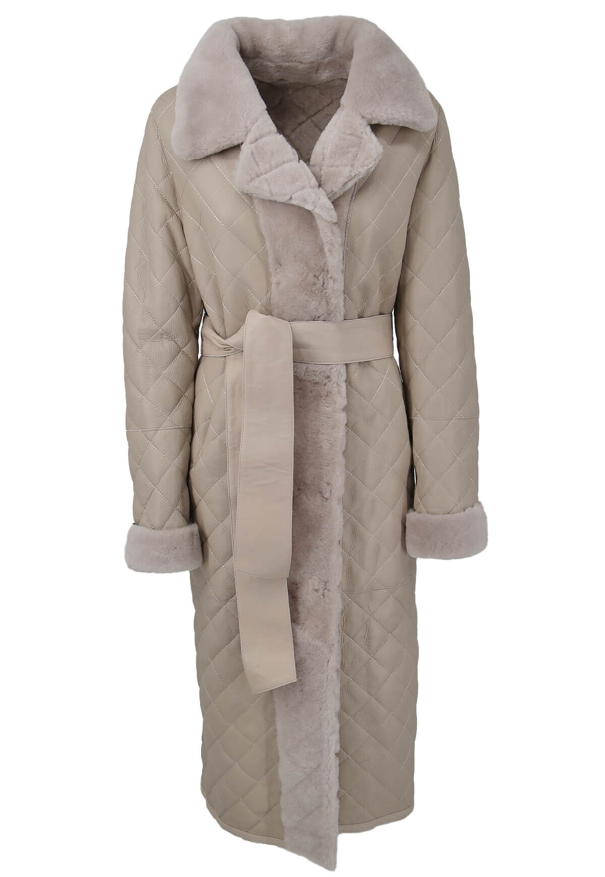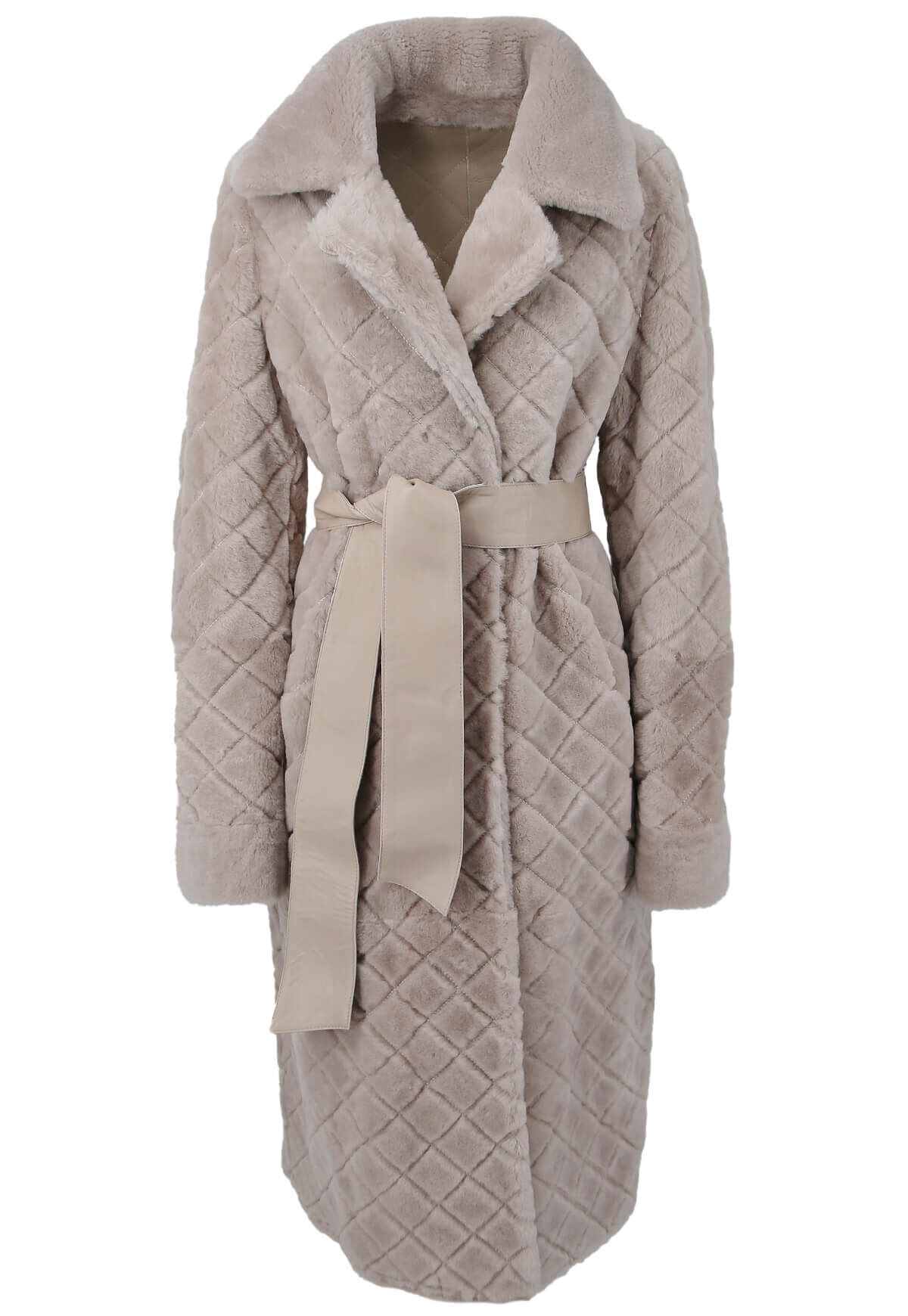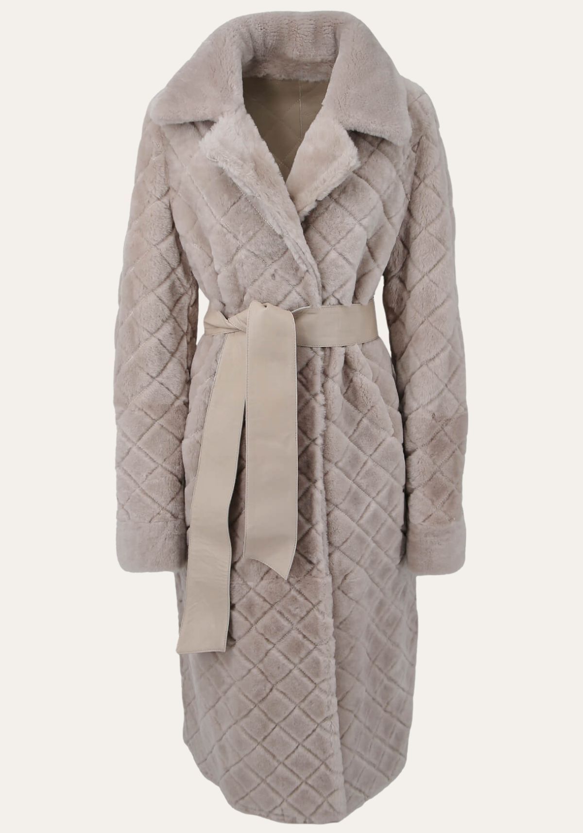 Entdecken Sie den Inbegriff von Eleganz und Stil mit unserem hochwertigen Damenmantel in edlem Beige, kunstvoll gefertigt aus feinstem Merino-Lammfell. Das exquisite Rautemuster verleiht diesem Mantel eine besondere Note und macht ihn zu einem zeitlosen Begleiter für jede Gelegenheit.