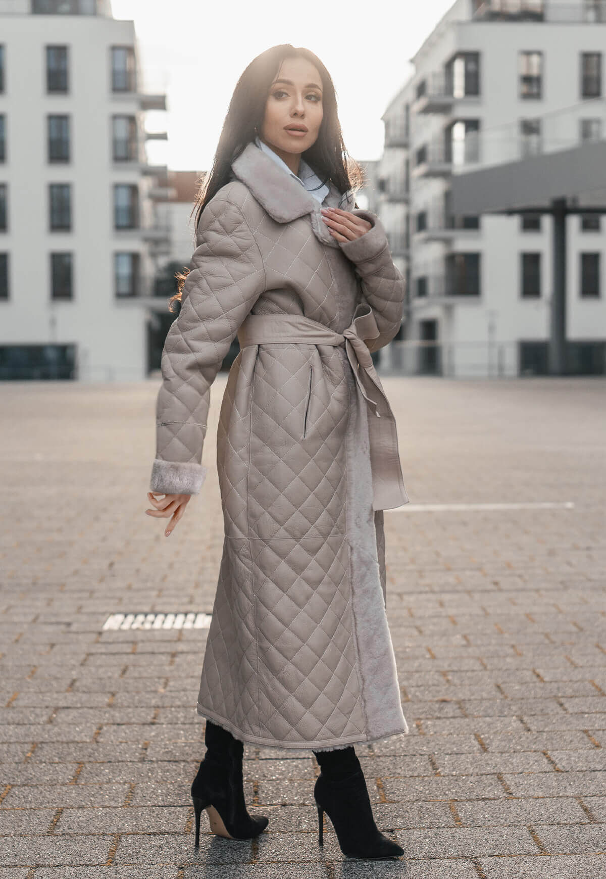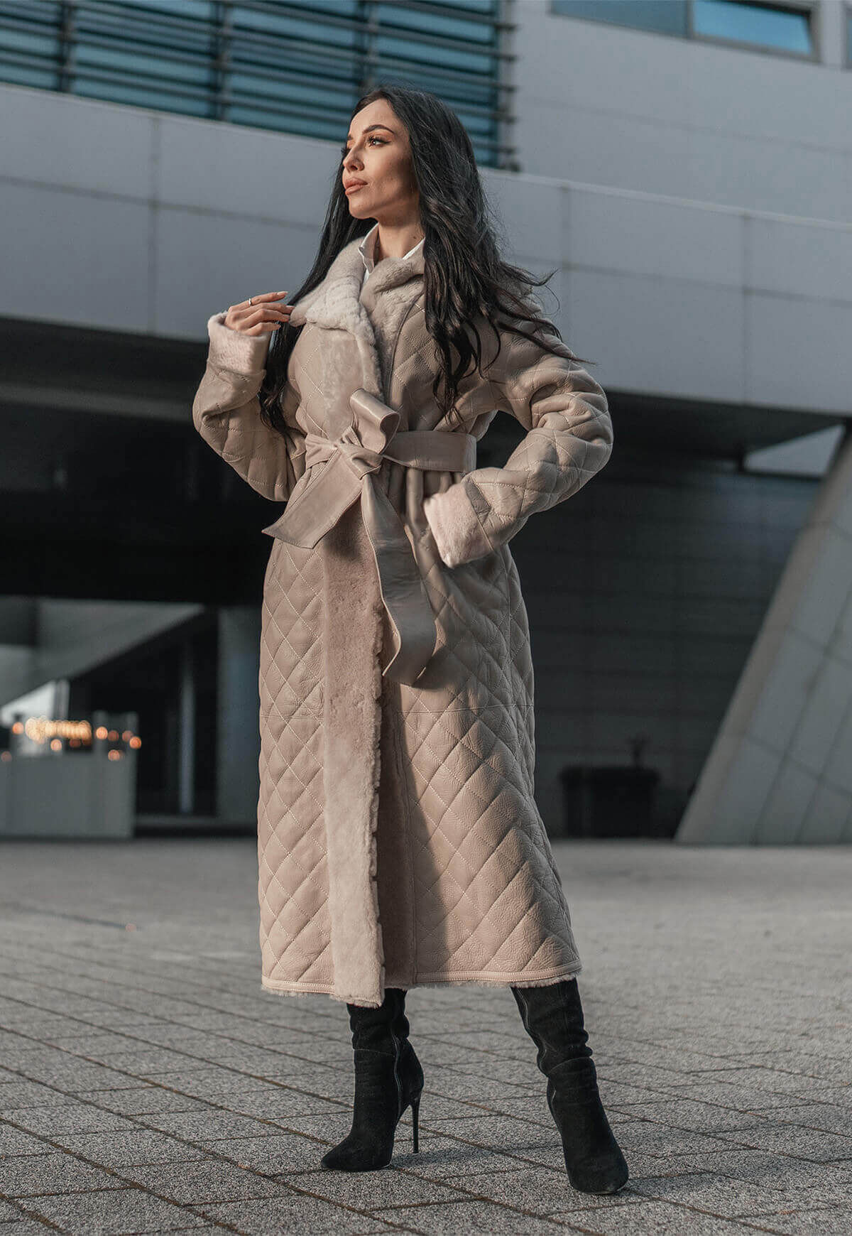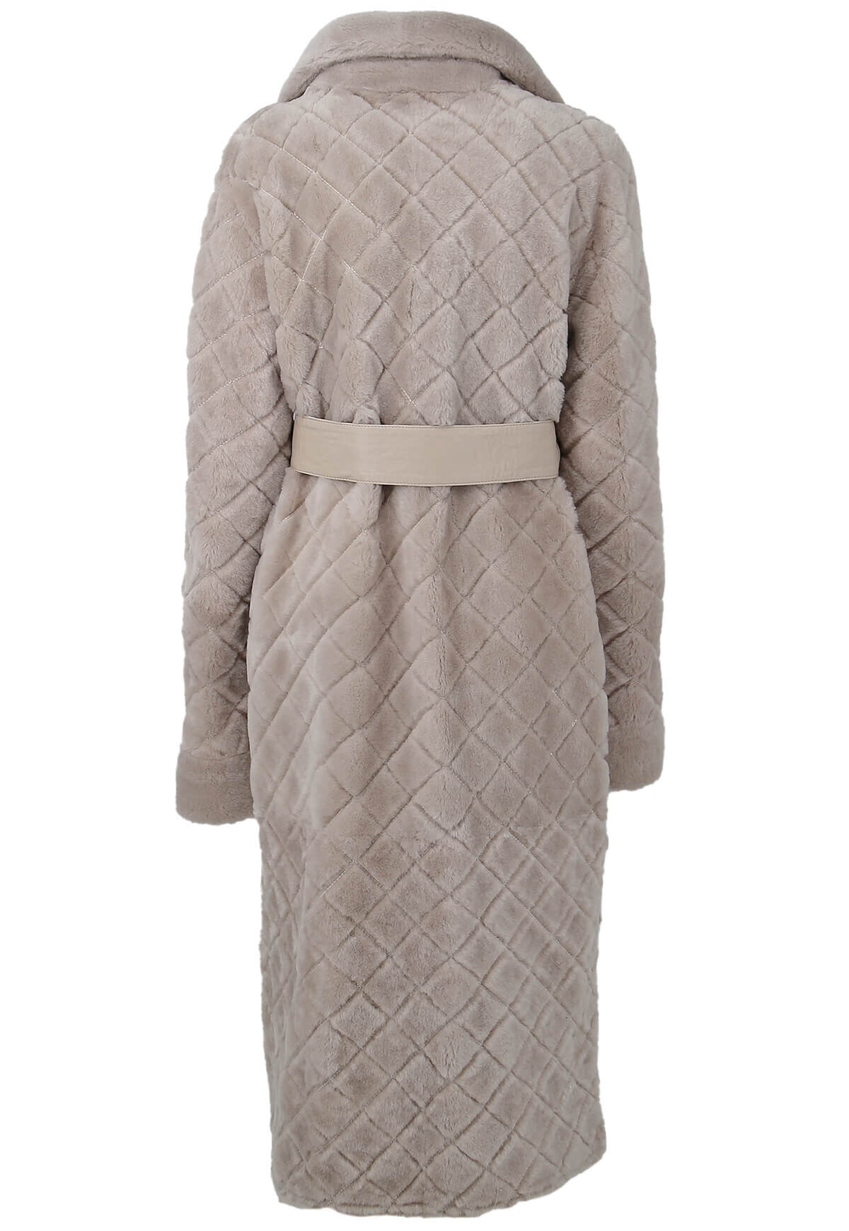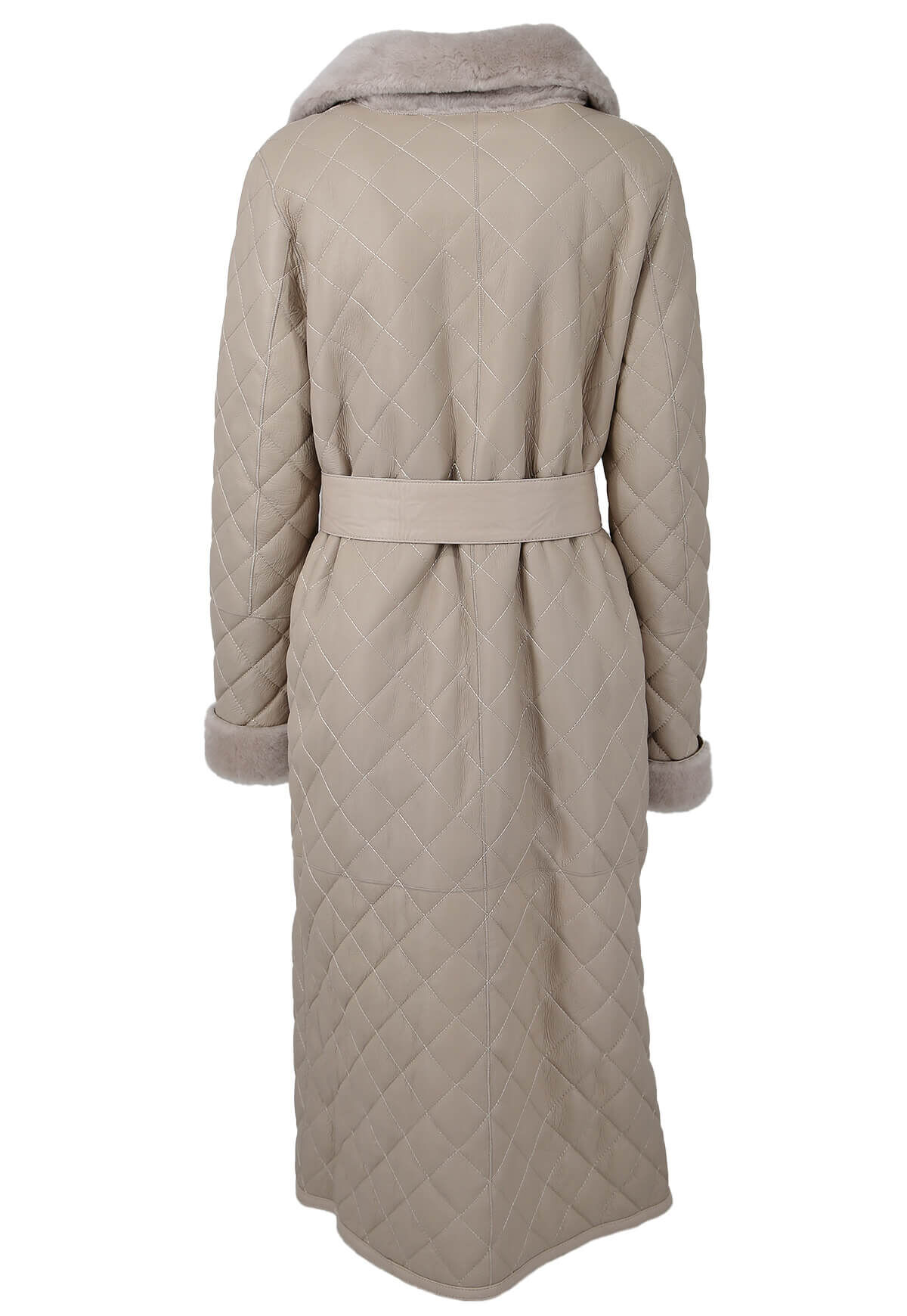 Entdecken Sie den Inbegriff von Eleganz und Stil mit unserem hochwertigen Damenmantel in edlem Beige, kunstvoll gefertigt aus feinstem Merino-Lammfell. Das exquisite Rautemuster verleiht diesem Mantel eine besondere Note und macht ihn zu einem zeitlosen Begleiter für jede Gelegenheit.