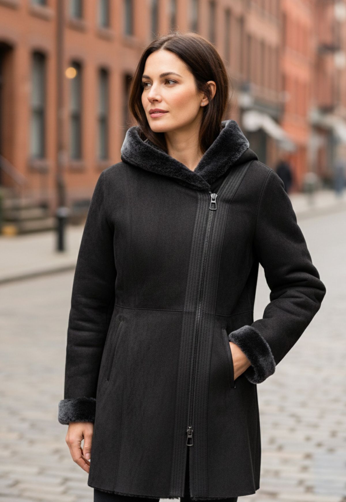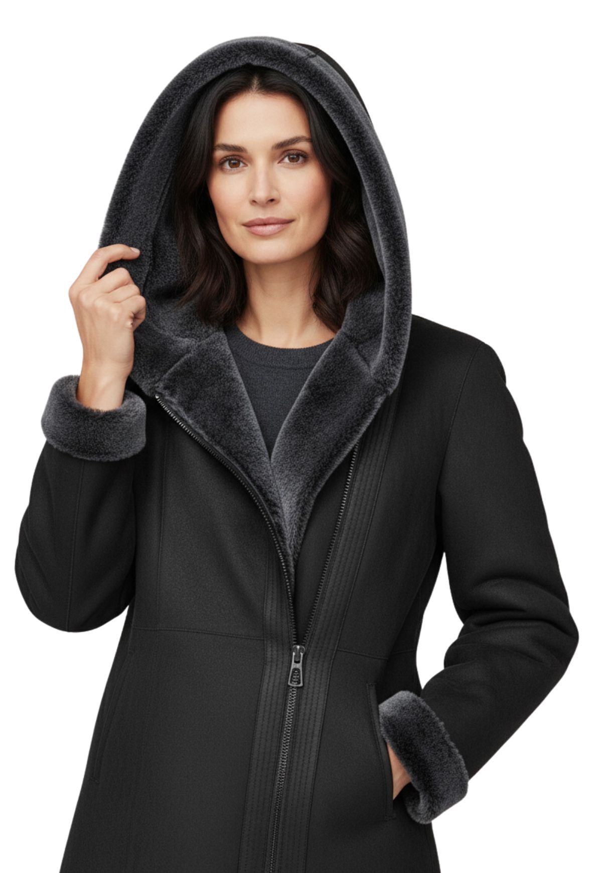Hergestellt aus bayerischen Merino Lammfellen, bietet dieser Mantel ein angenehm leichtes Tragegefühl, das sowohl Komfort als auch Stil vereint. Die großzügige Kapuze schützt Sie zusätzlich vor Wind und eisigen Temperaturen, während die Ärmelenden bei Bedarf umgekrempelt werden können, um optimalen Schutz und Flexibilität zu gewährleisten.
