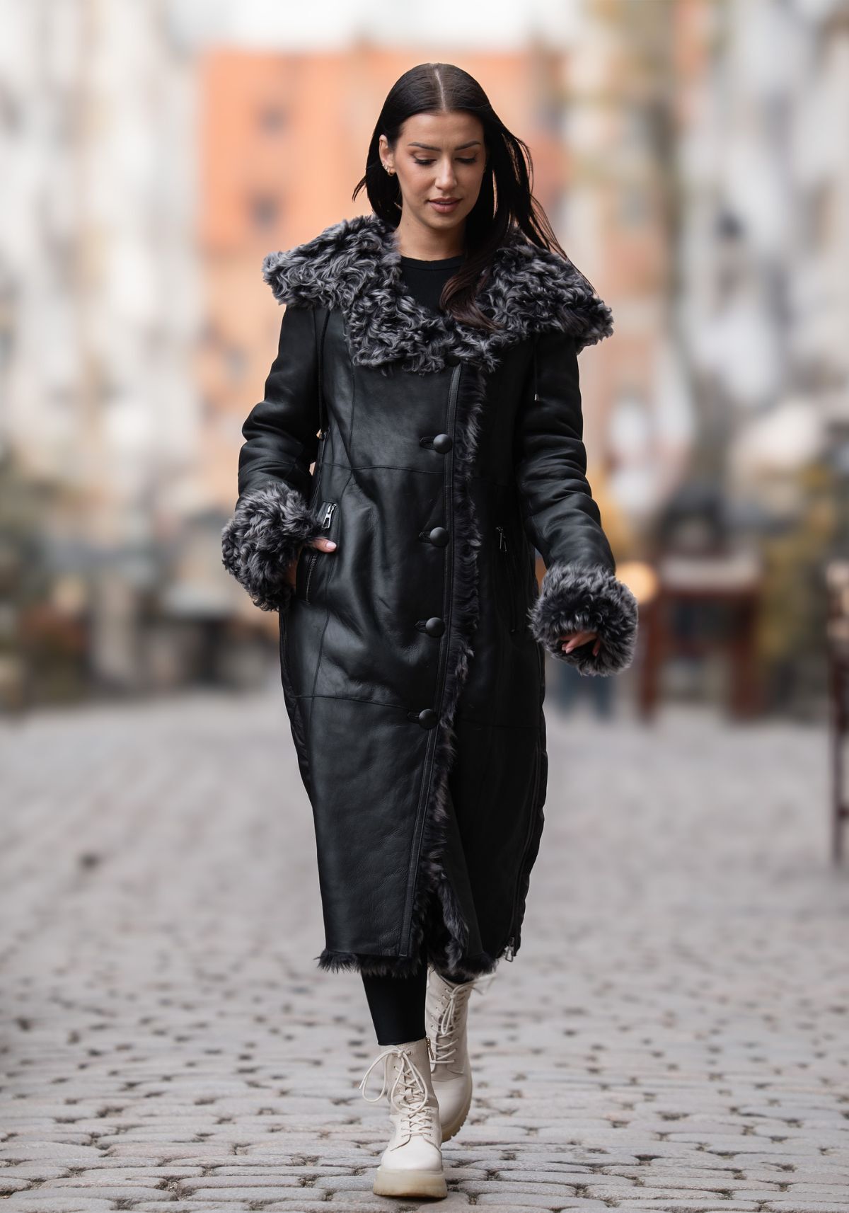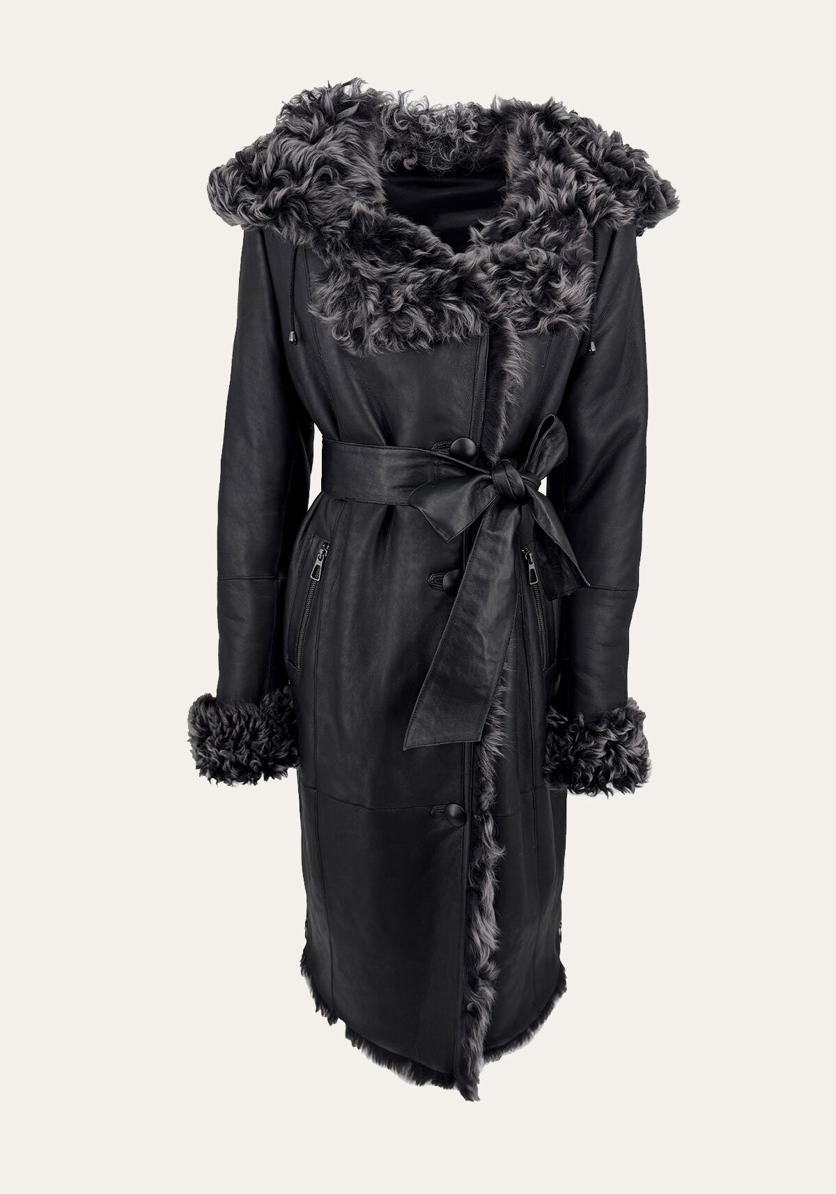 Dieser Damenmantel aus hochwertigem, gelocktem Lammfell ist die perfekte Mischung aus Eleganz und sportlichem Flair. Die Innenseite und Ärmel sind aus weichem, kuscheligem Lammfell, während die Außenseite aus geschmeidigem Lammleder besteht, das dem Mantel eine edle Note verleiht.