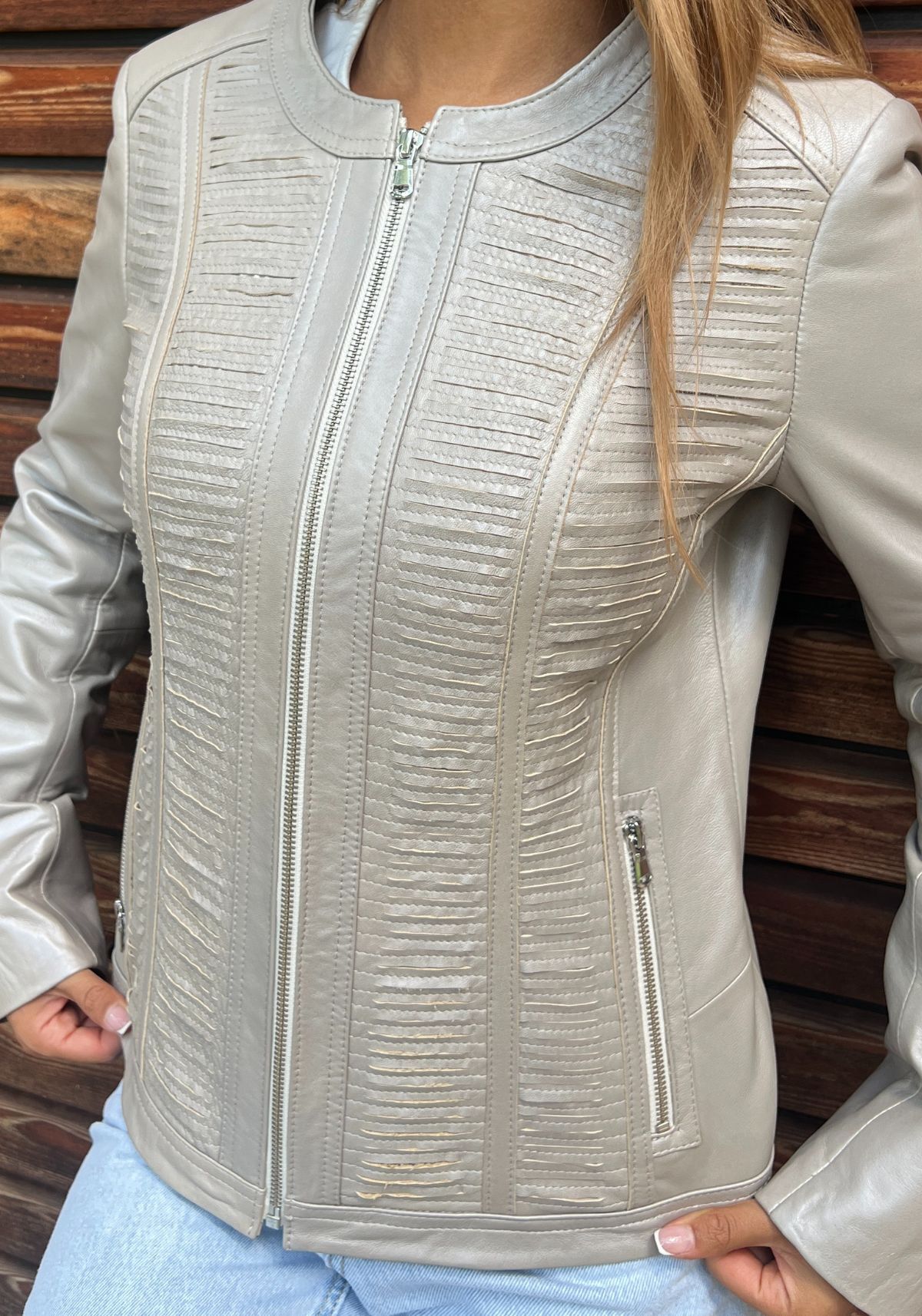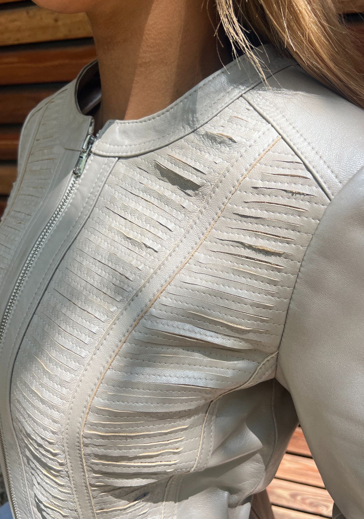- die querverarbeitenden Lederstreifen verleihen der Jacke einen sportlichen Look