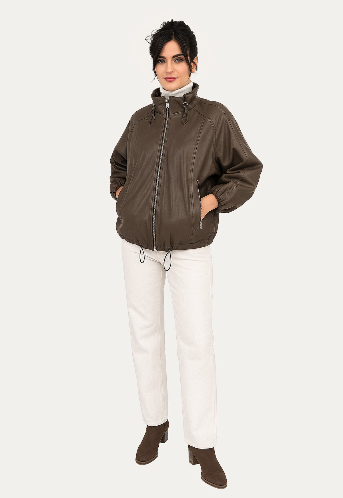 Mit ihrem hohen Kragen, der sich lässig umlegen lässt, eignet sich diese Lederjacke sowohl für den Alltag als auch für spezielle Anlässe. Kombinieren Sie sie mit Jeans, einem Kleid oder Ihrer Lieblingshose – diese Jacke ist ein vielseitiges Kleidungsstück, das in keiner Damen-Garderobe fehlen sollte.