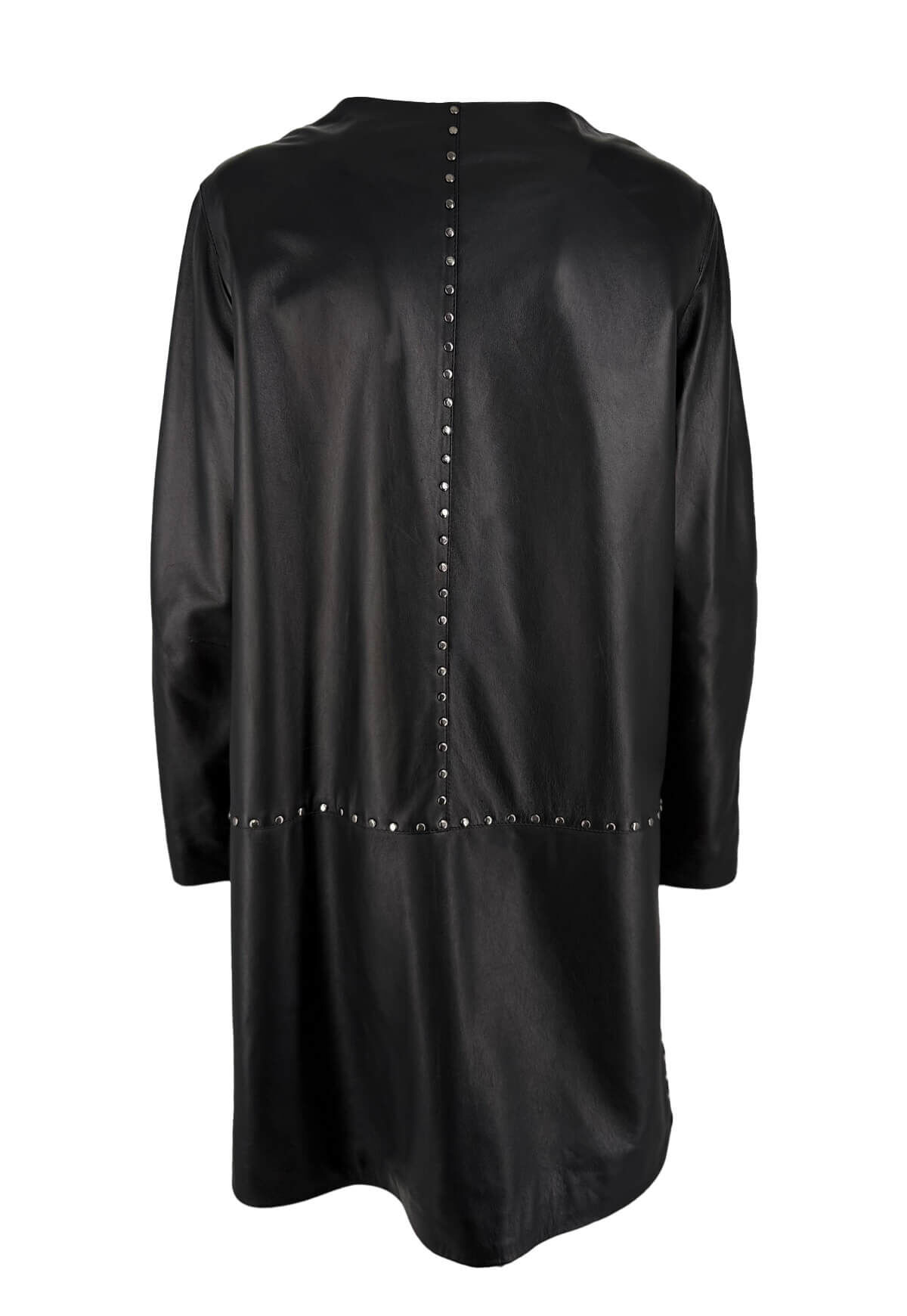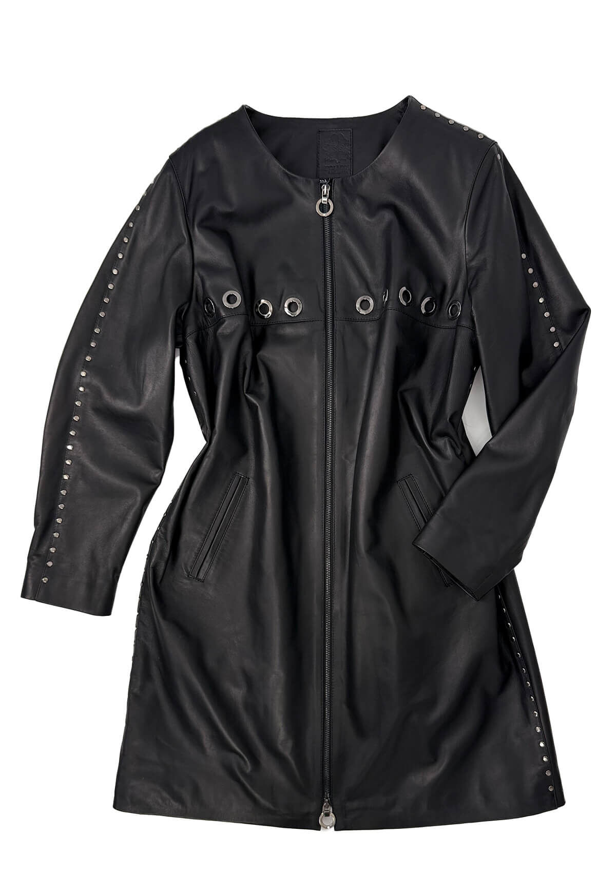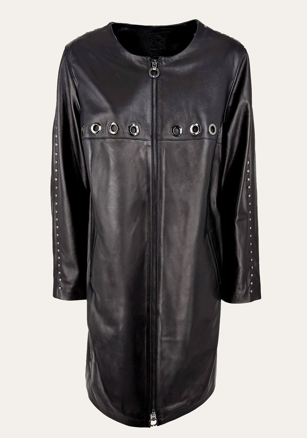 - Gerader Schnitt mit auffälligen Nieten und Ösen komplettieren den femininen Look
