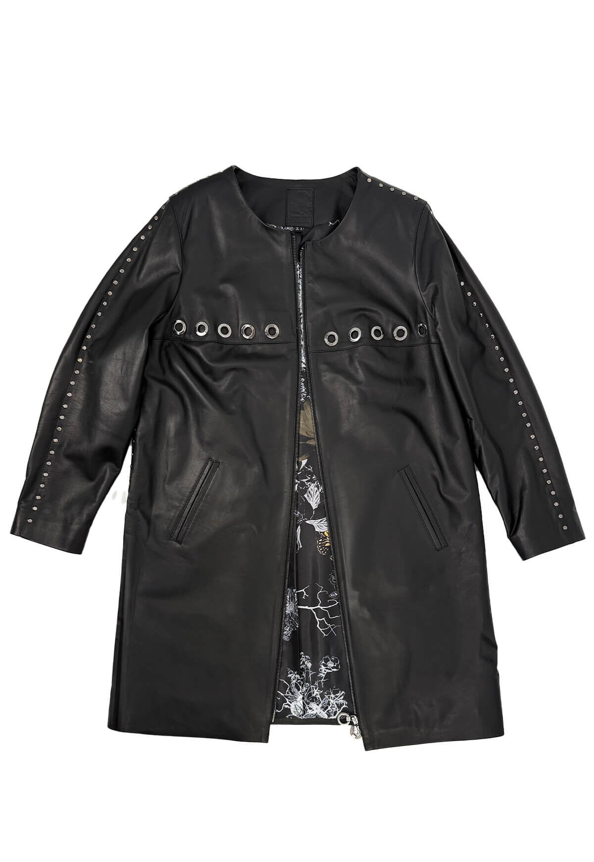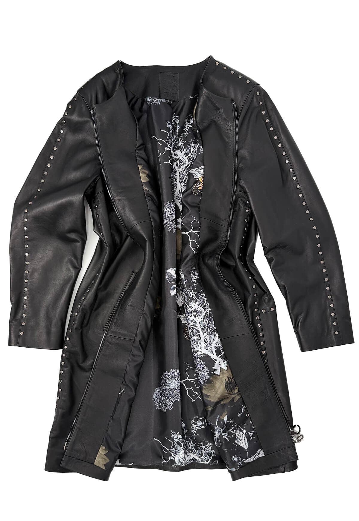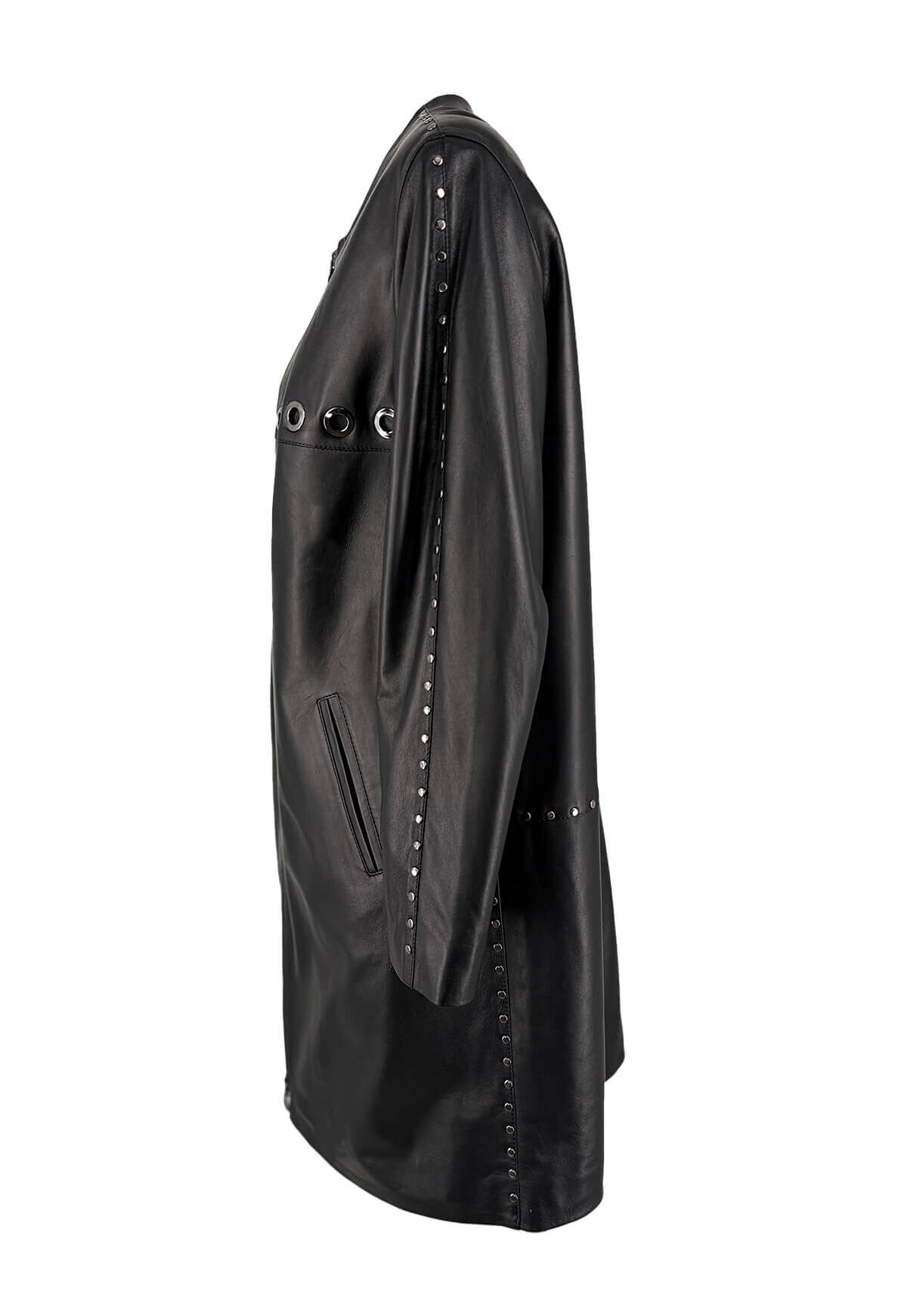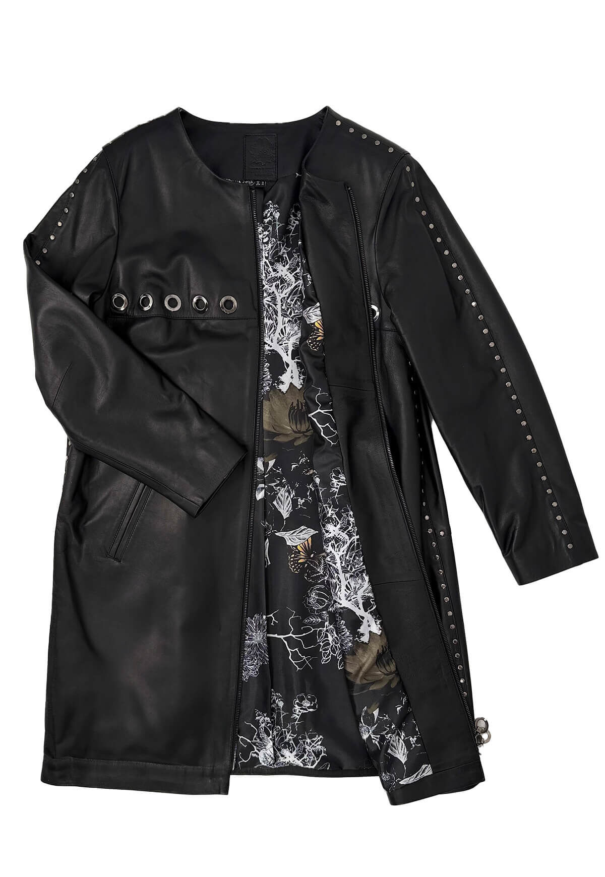 - Gerader Schnitt mit auffälligen Nieten und Ösen komplettieren den femininen Look