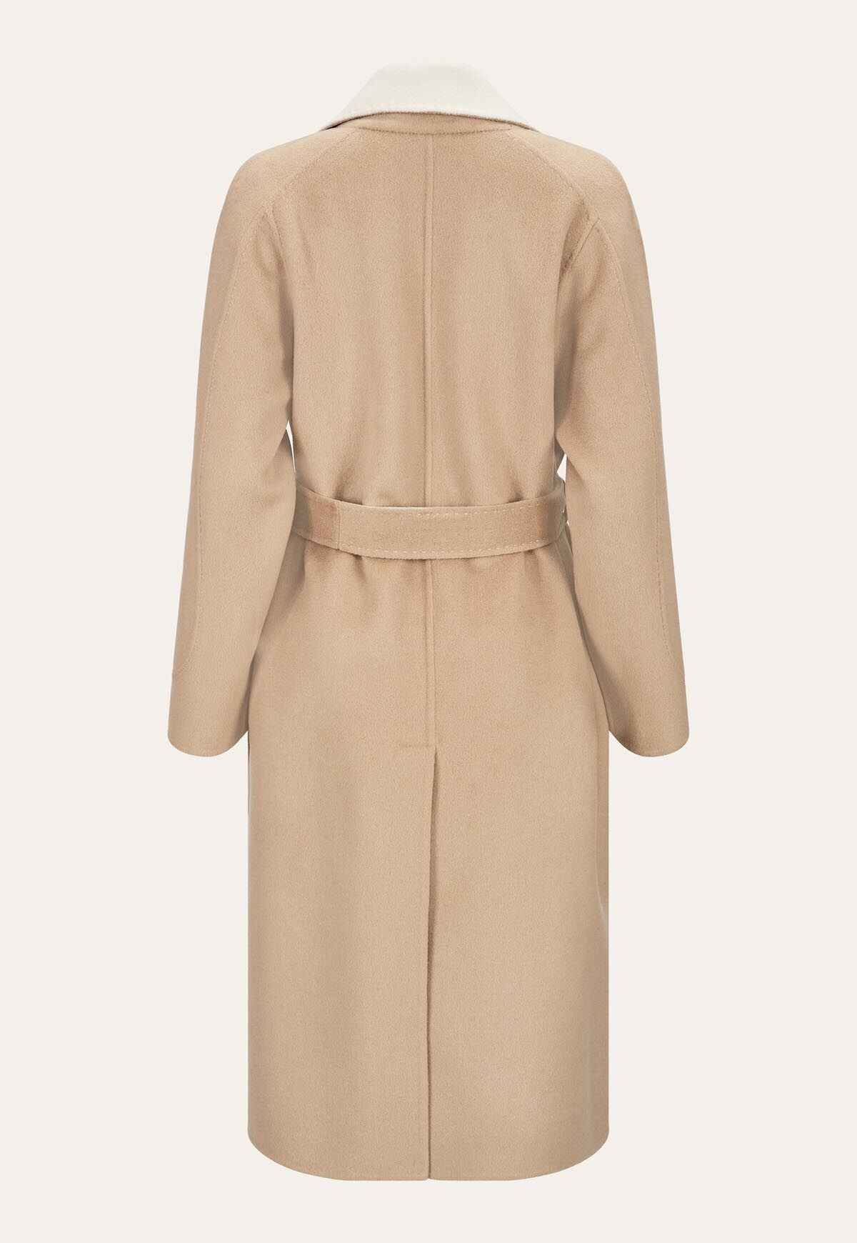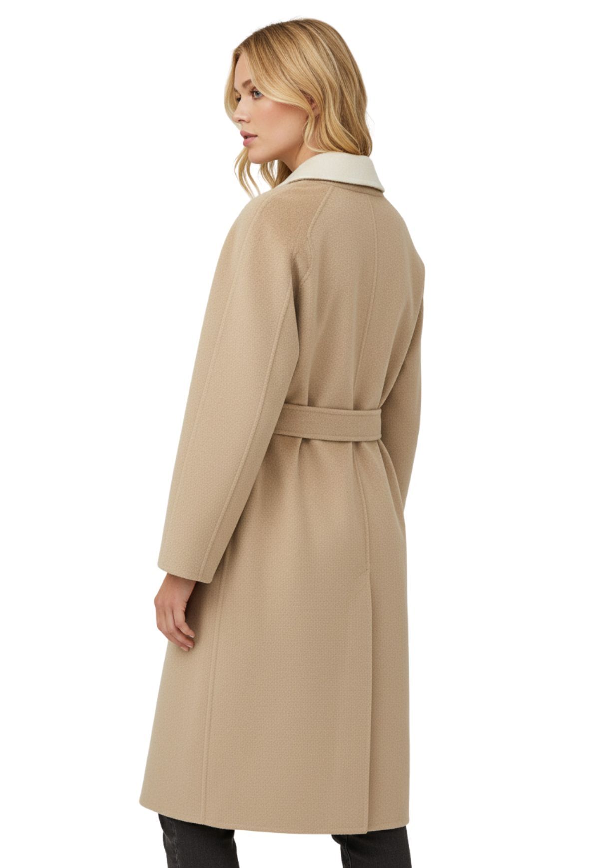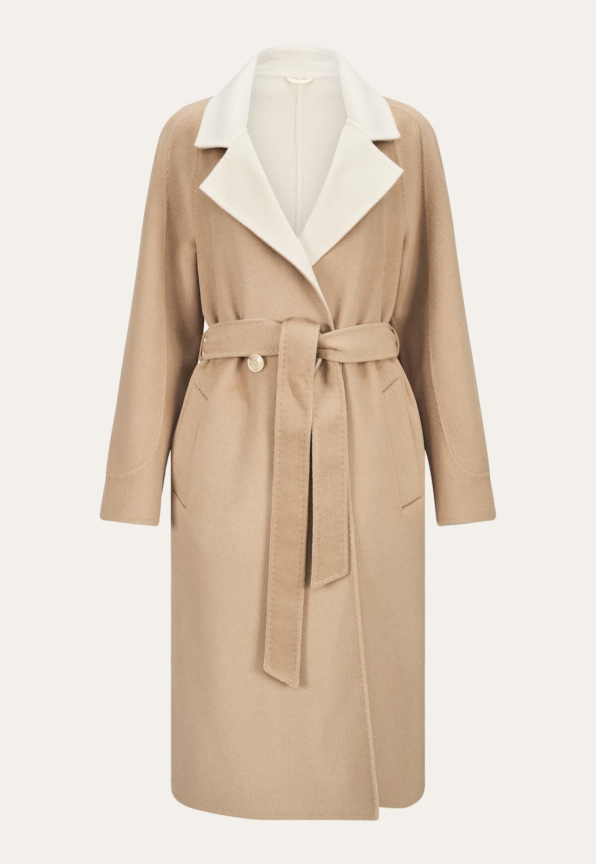 Der traditionelle Reverskragen verleiht dem Mantel eine stets elegante Ausstrahlung. Außen zeigt er sich in einem ansprechenden Beigeton, während er innen in einem sanften Creme gehalten ist.