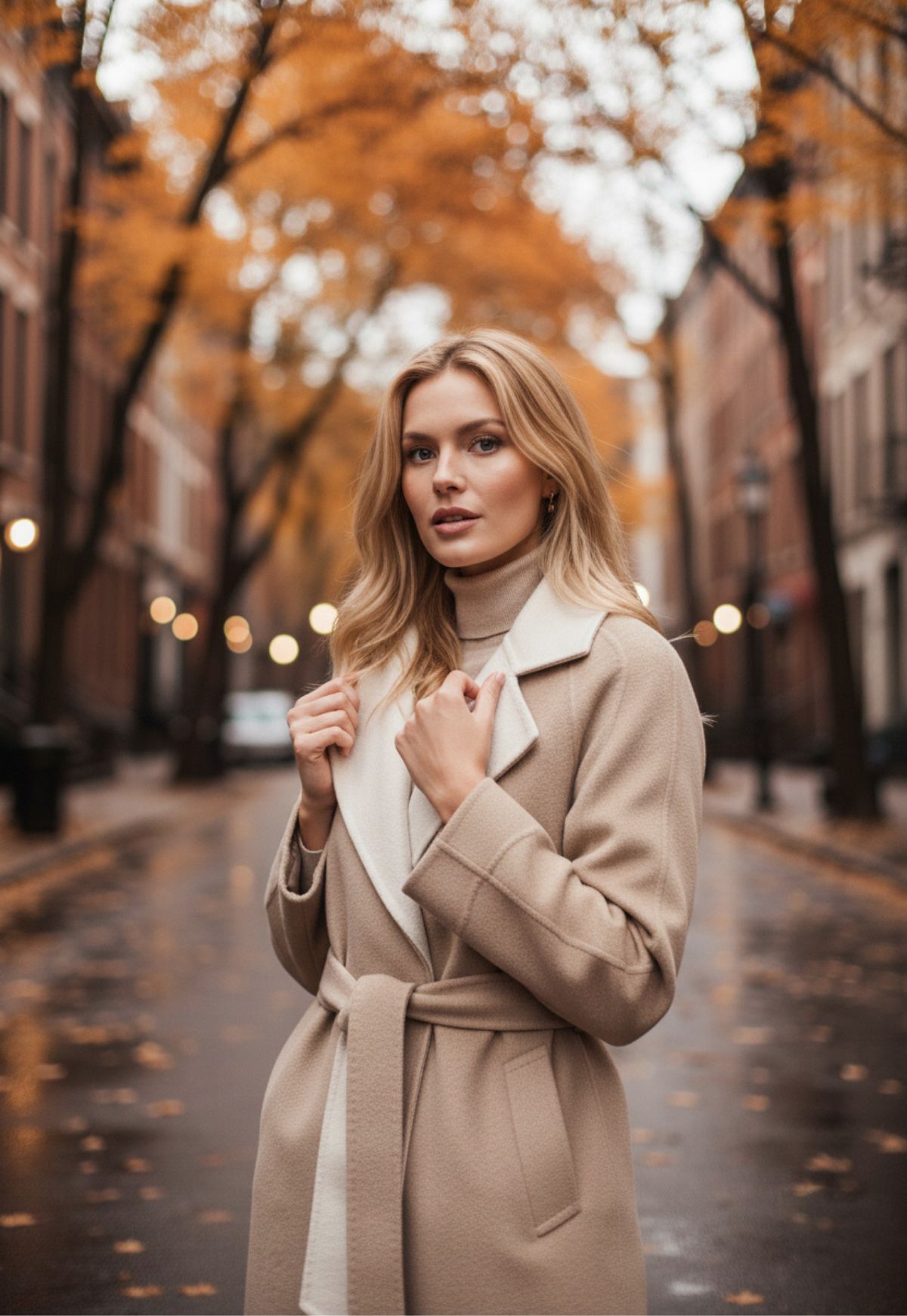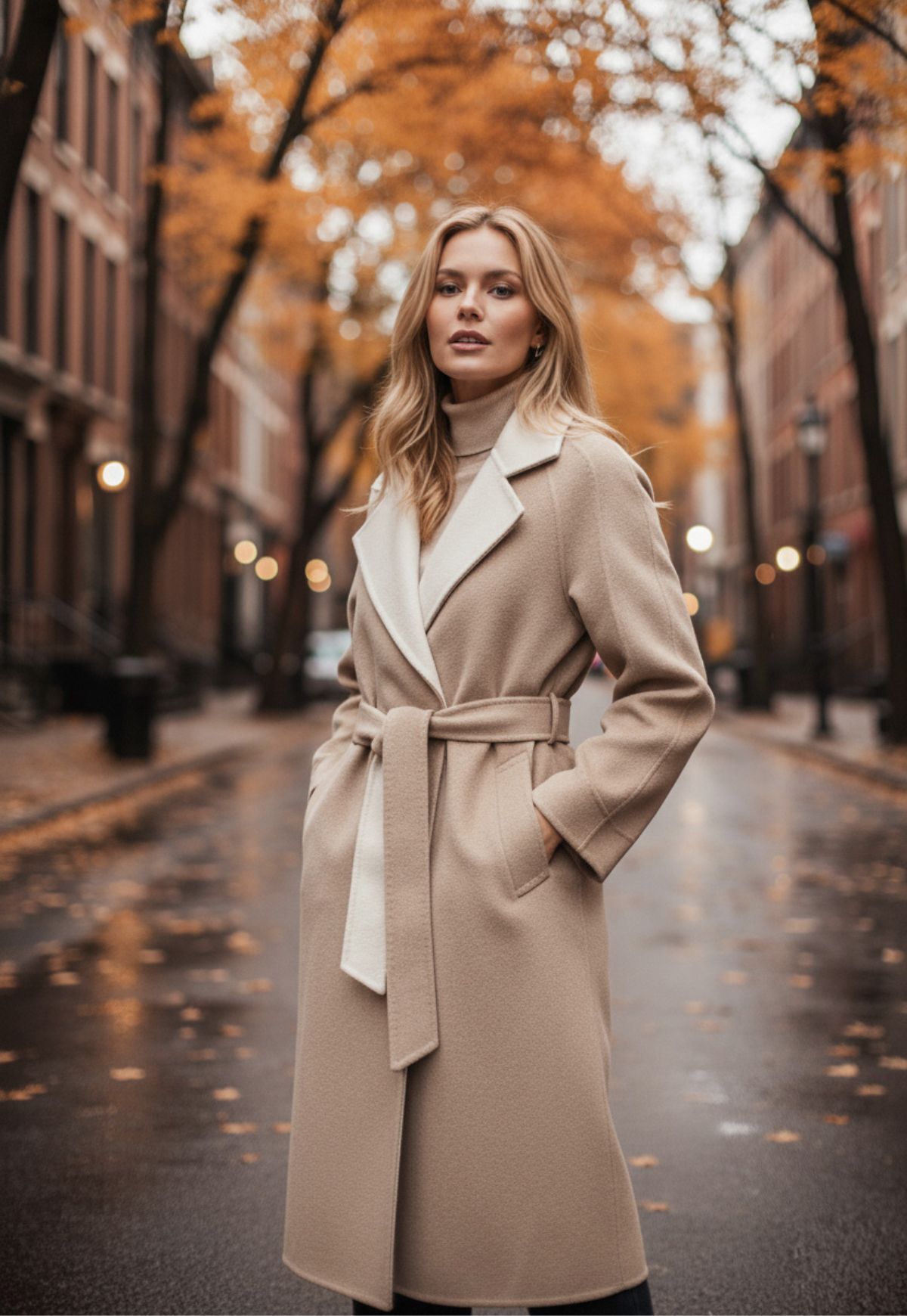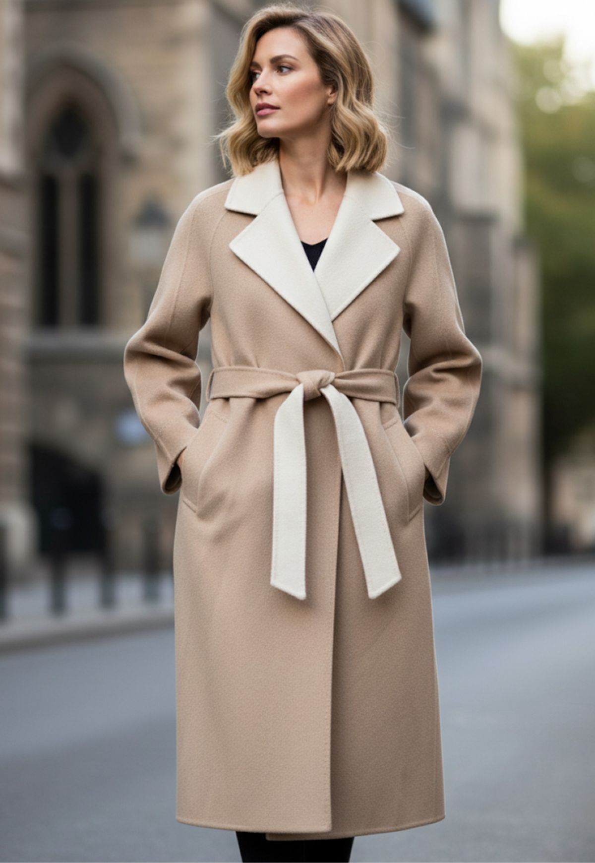 Die Silhouette des Wollmantels umschmeichelt den Körper optimal, während der passende Gürtel die Taille gekonnt in Szene setzt.