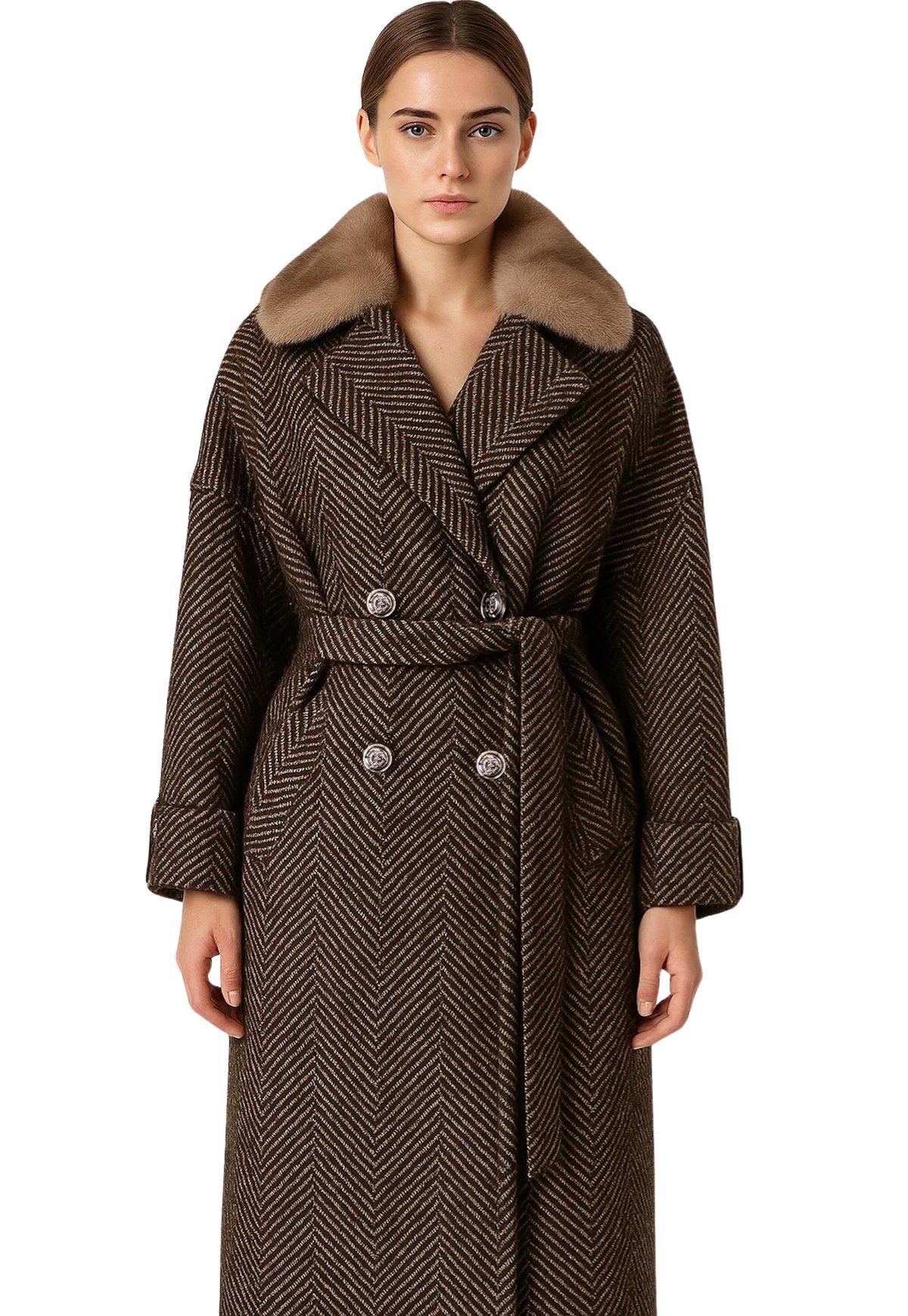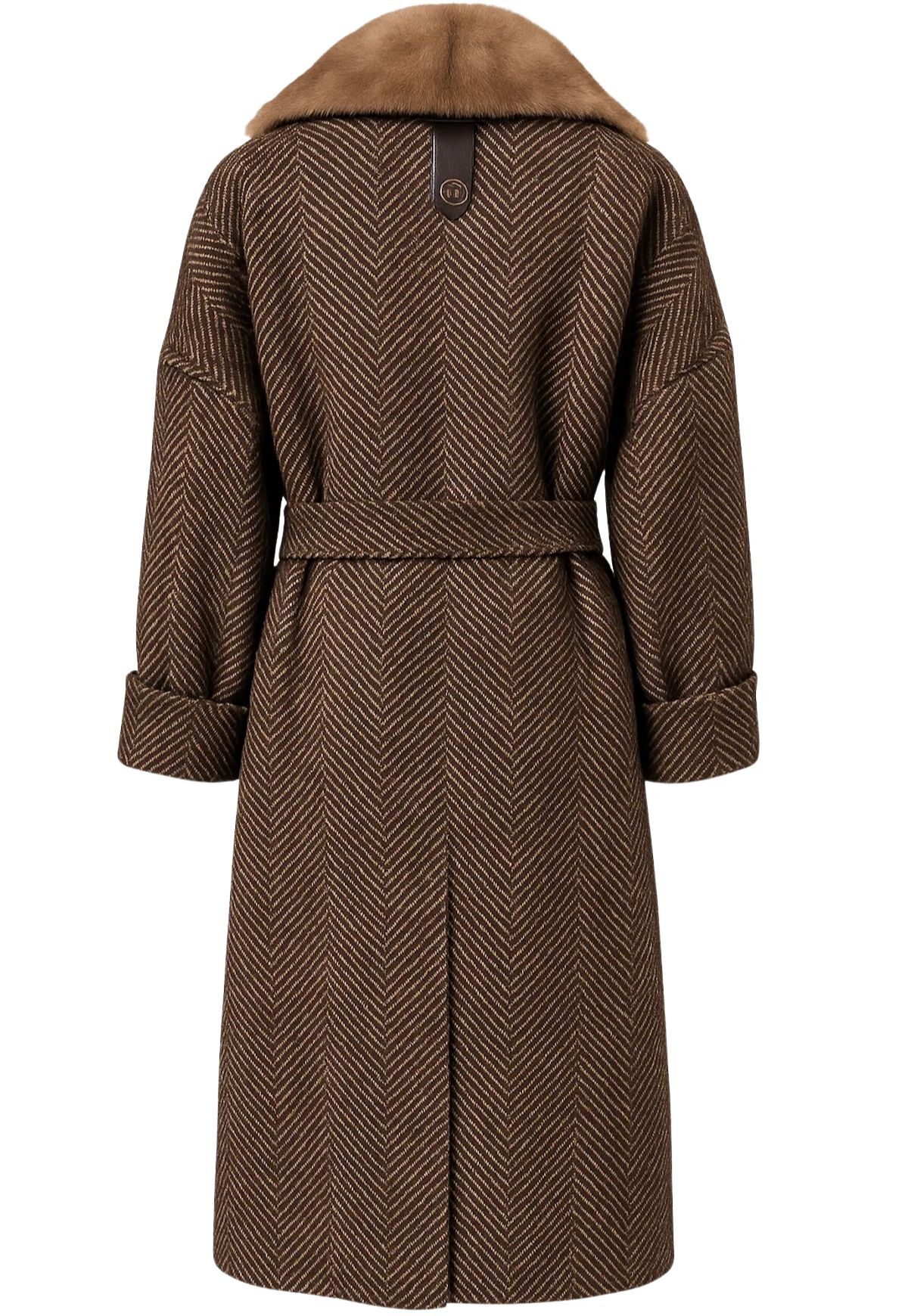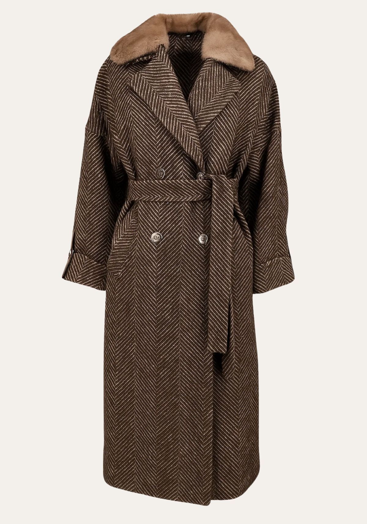 Das feine Fischgrätmuster unterstreicht seine stilvolle Struktur, während die sanft überschnittenen Schultern und der lockere Schnitt eine moderne, feminine Silhouette schaffen. Der Fellkragen, durch dezente Knöpfe abnehmbar, verleiht dem Mantel eine wandelbare Note – von elegant bis puristisch.