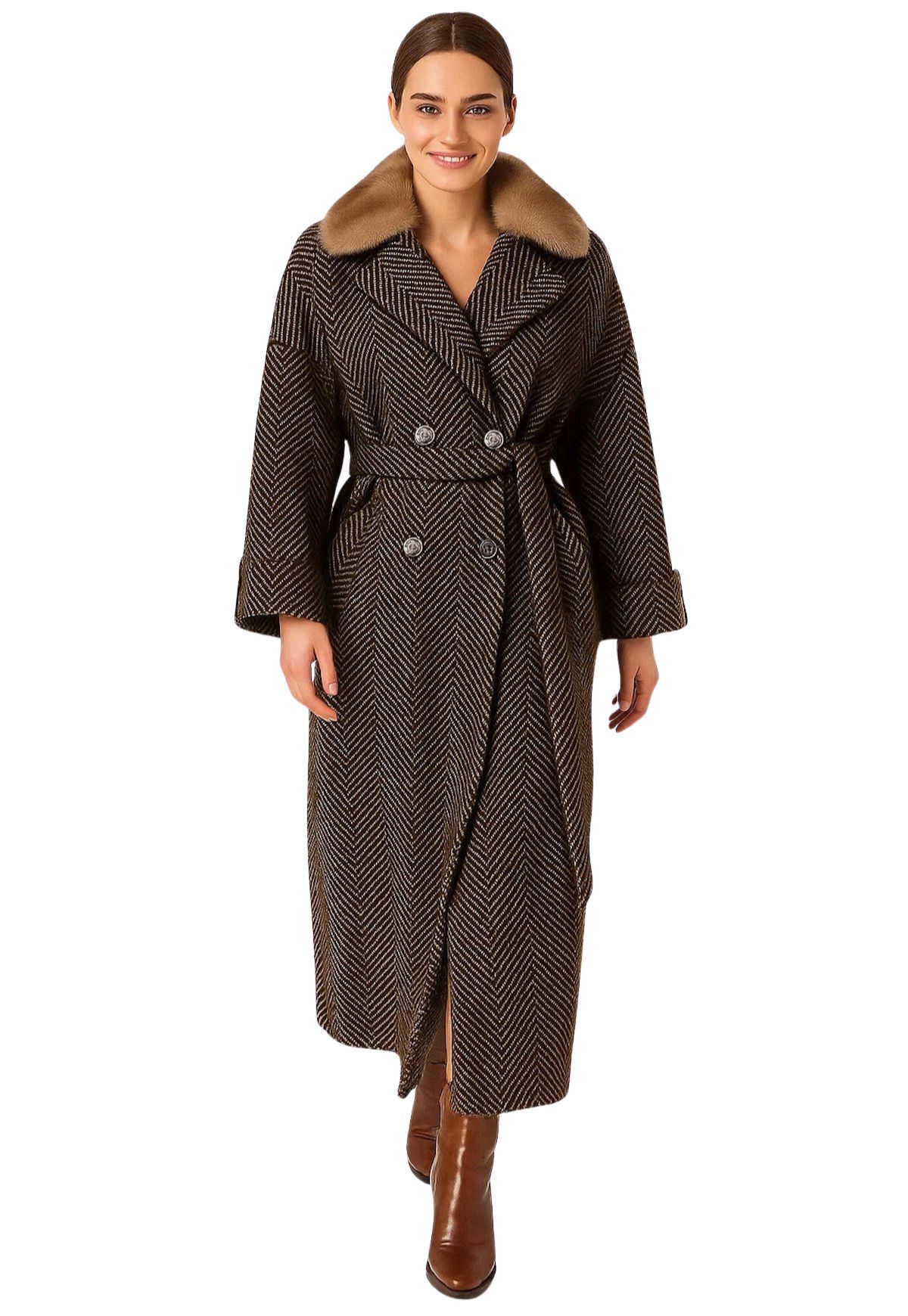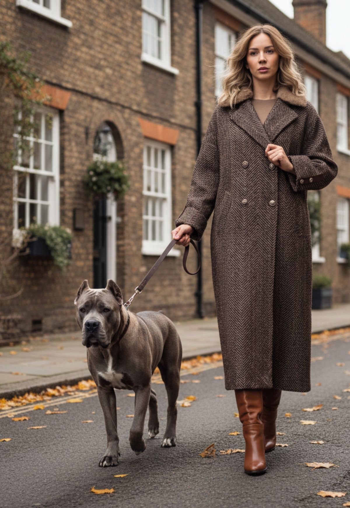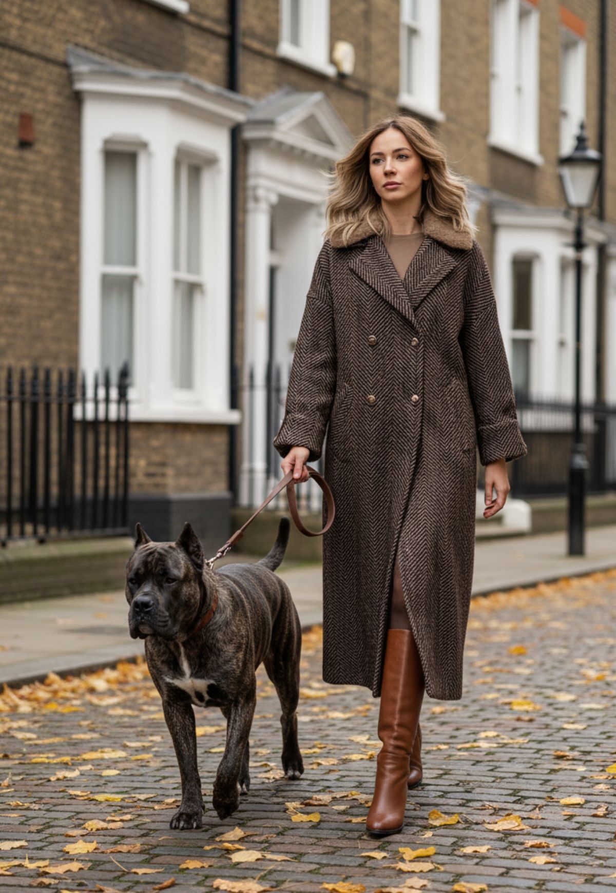 Das feine Fischgrätmuster unterstreicht seine stilvolle Struktur, während die sanft überschnittenen Schultern und der lockere Schnitt eine moderne, feminine Silhouette schaffen. Der Fellkragen, durch dezente Knöpfe abnehmbar, verleiht dem Mantel eine wandelbare Note – von elegant bis puristisch.