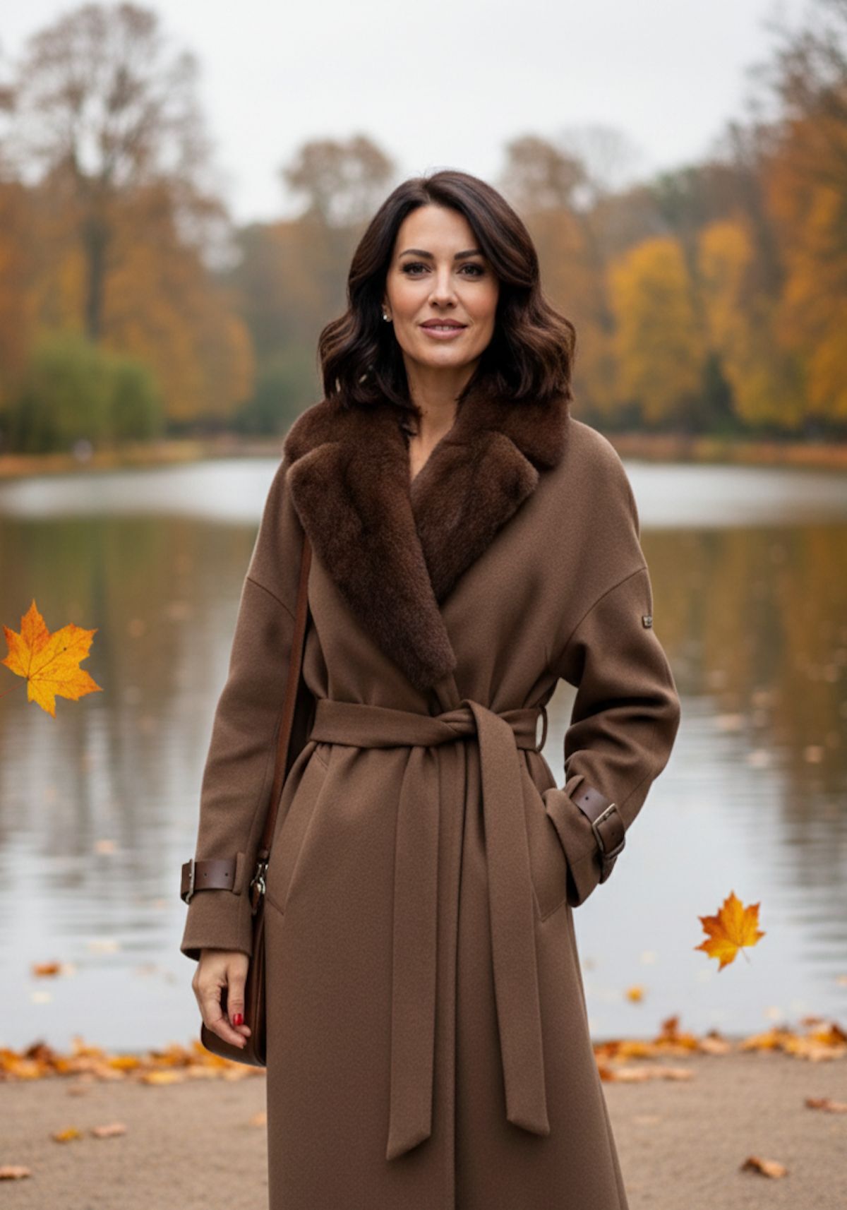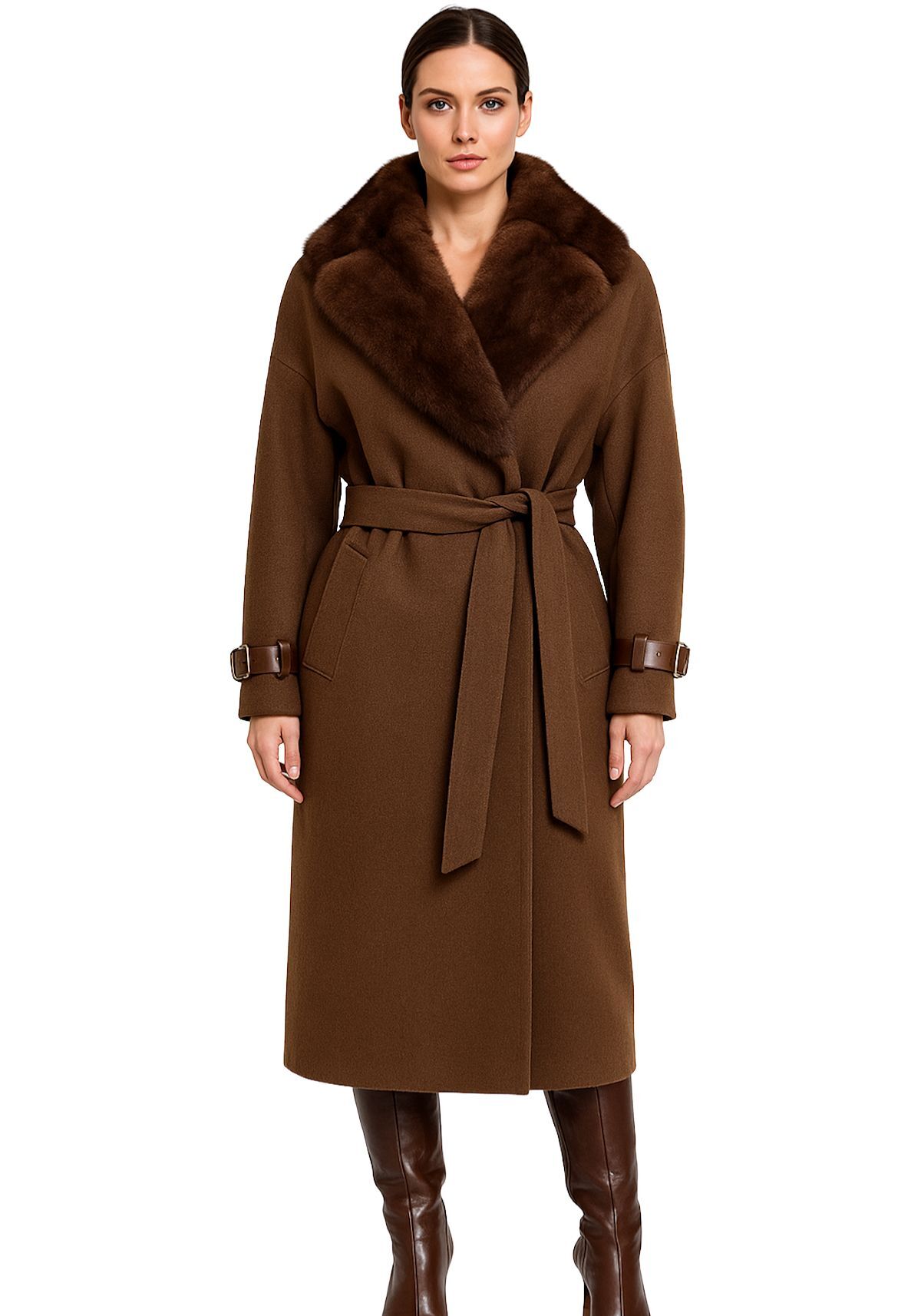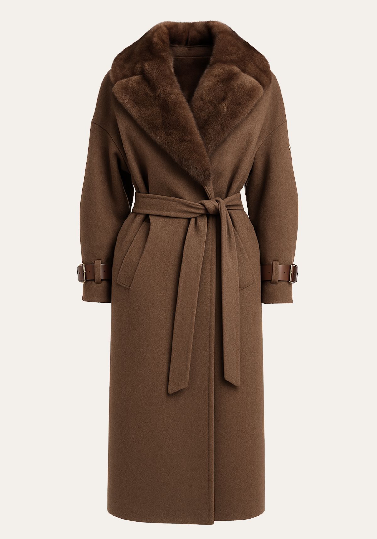 Breite Ärmelabschlüsse mit feinen Lederriegeln setzen dezente Akzente und vollenden das harmonische Gesamtbild – ein Mantel, der Eleganz und Understatement in perfekter Balance verkörpert.