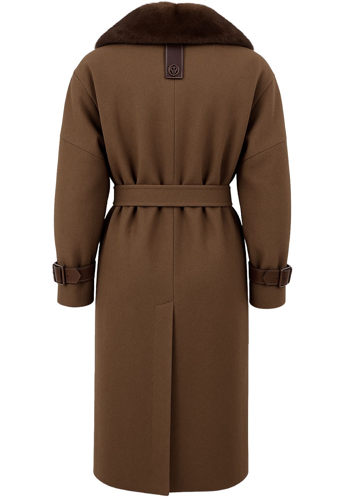 Ein rückseitiger Schlitz sorgt für angenehme Bewegungsfreiheit, während ein innenliegendes Band mit Öse und ein zusätzlicher Bindegürtel den Mantel sicher schließen und die Taille elegant betonen. Die hochwertige Materialkomposition schenkt ein weiches, anschmiegsames Tragegefühl und unterstreicht die kompromisslose Qualität dieses Designs.