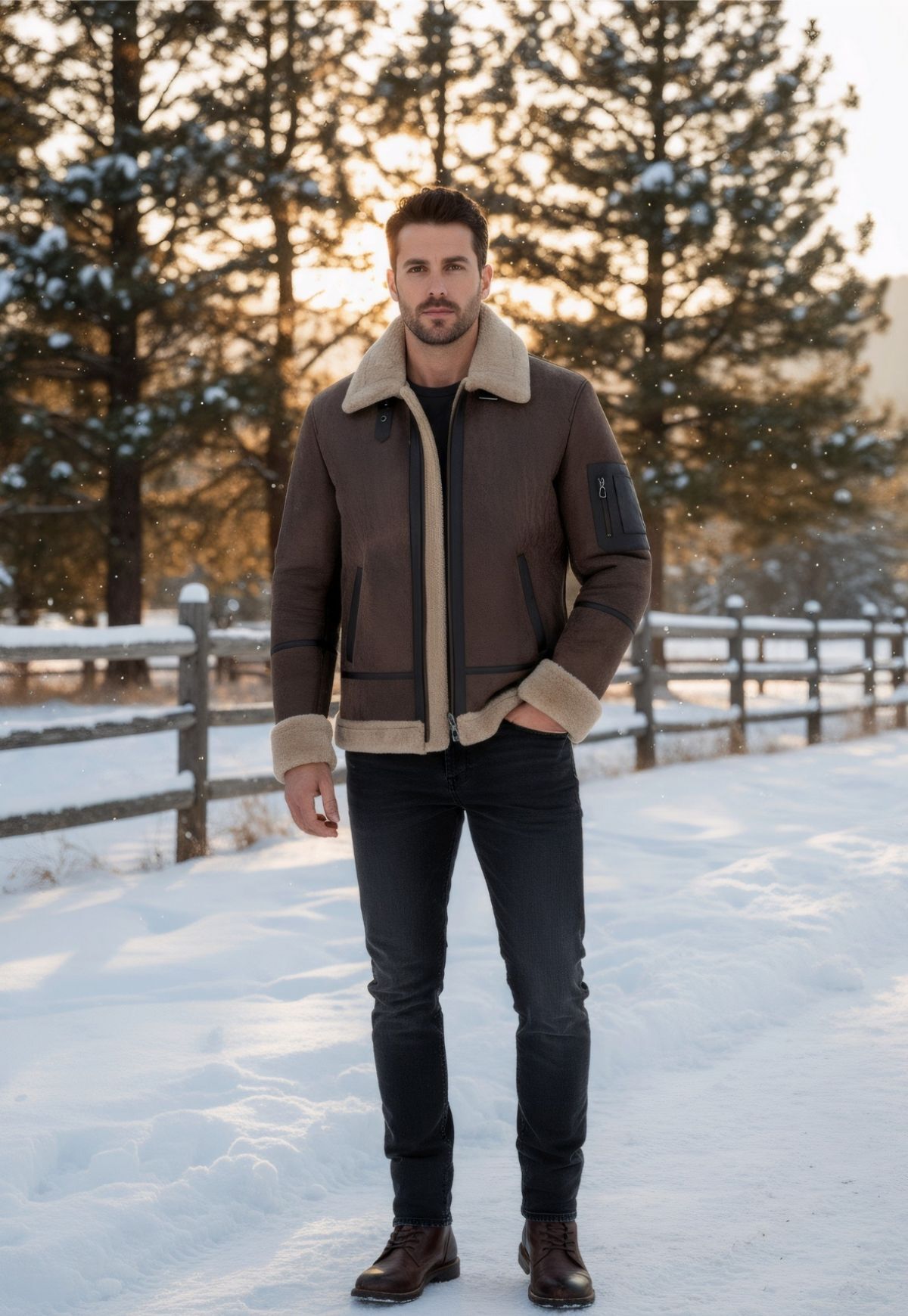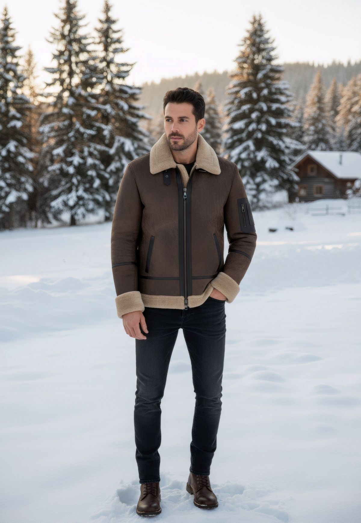Die Shearling Fliegerjacke „Flyer Jack“ ist eine Hommage an die legendären Pilotenjacken vergangener Zeiten – kombiniert mit luxuriöser Handwerkskunst und modernem Design. Gefertigt aus feinstem Lammfell (Shearling) vereint sie maskuline Eleganz, außergewöhnliche Wärme und unvergleichlichen Tragekomfort.