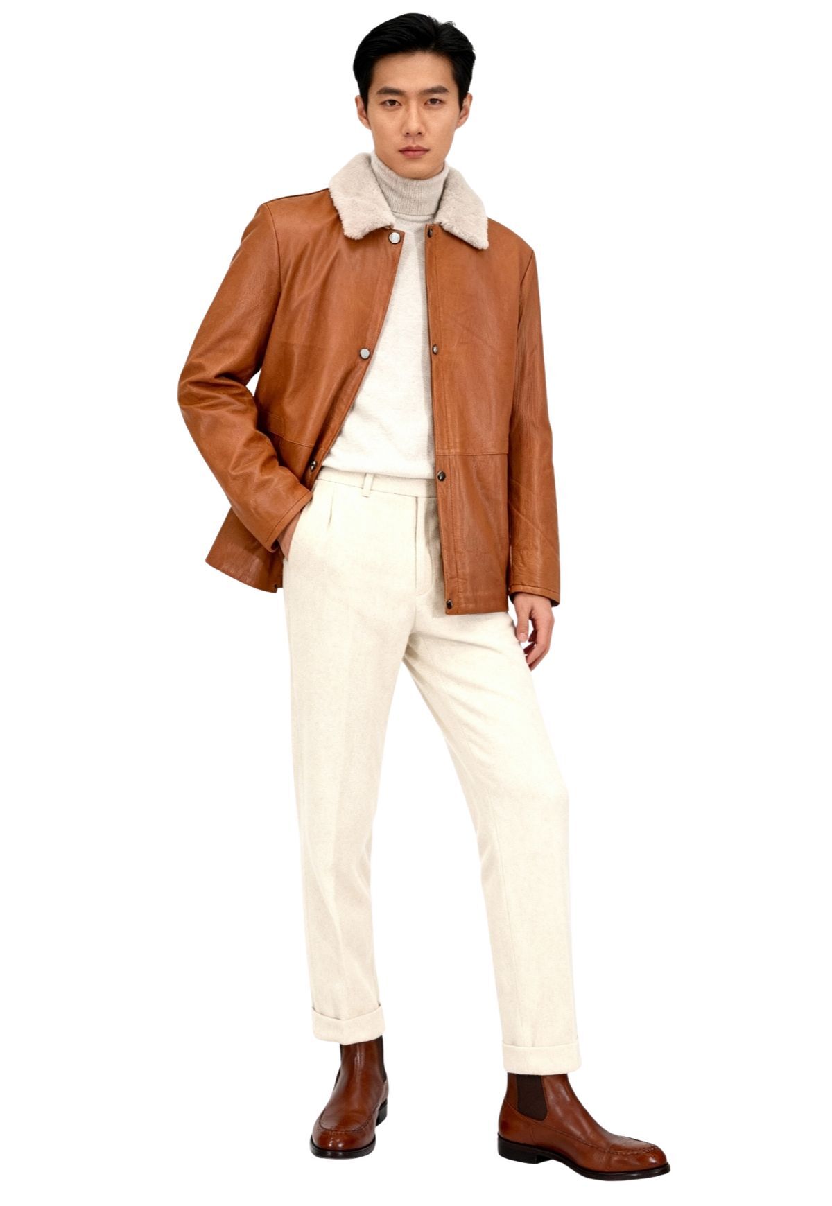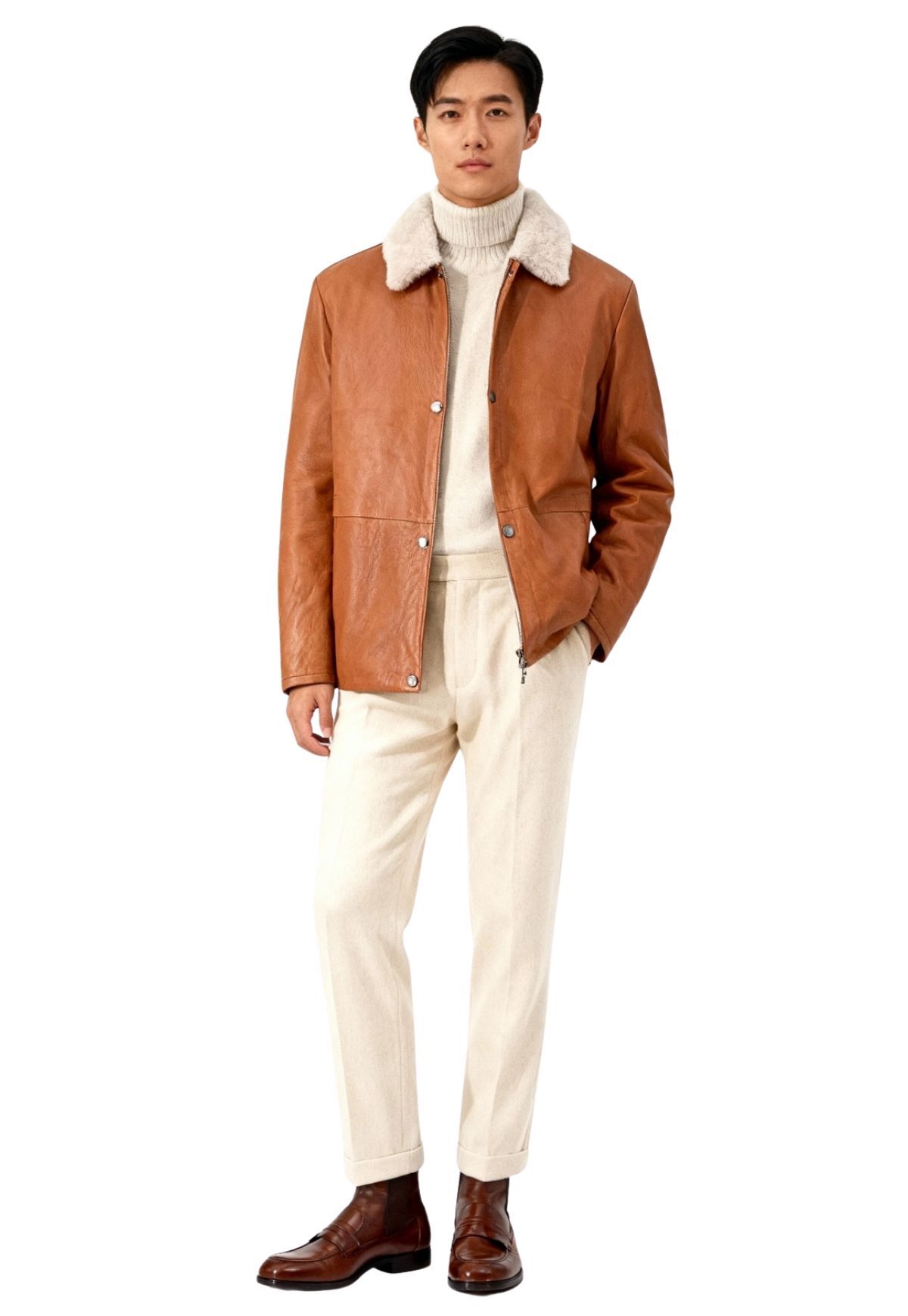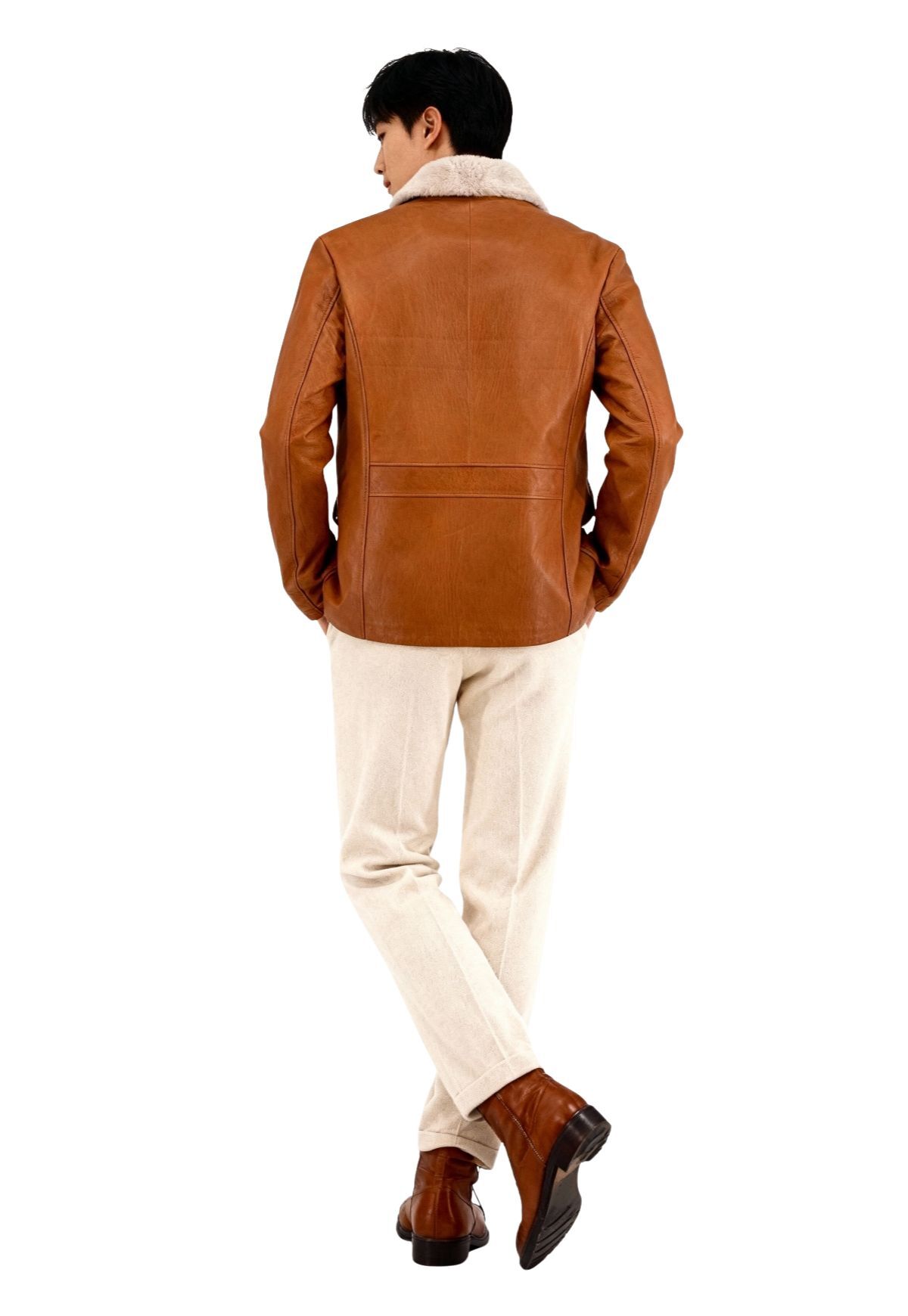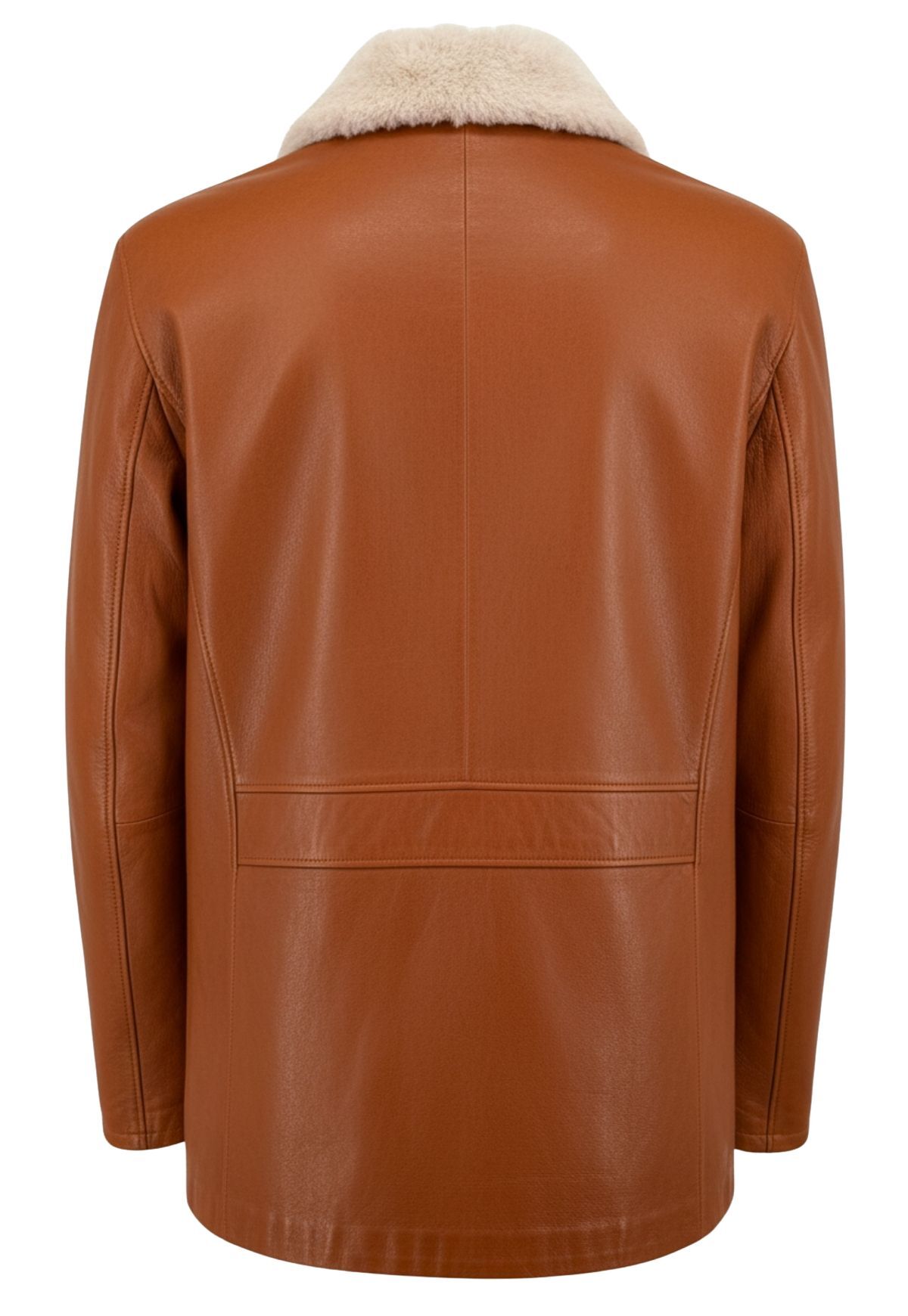 Die Ärmel sind bewusst ohne Lammfellfutter und leicht wattiert gearbeitet – für maximale Bewegungsfreiheit und ein angenehm leichtes Tragegefühl. Der weiche Shearling-Kragen schenkt wohlige Wärme und betont zugleich den luxuriösen Charakter des Modells.