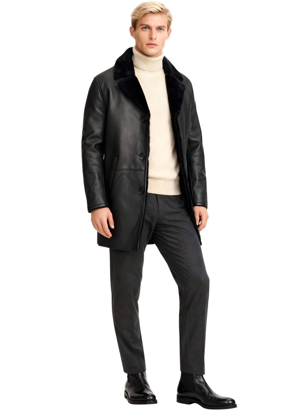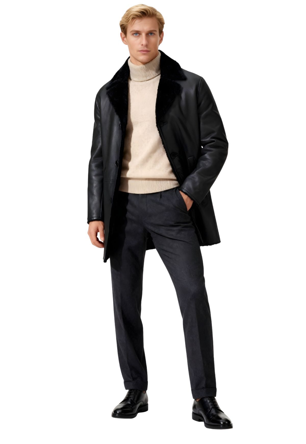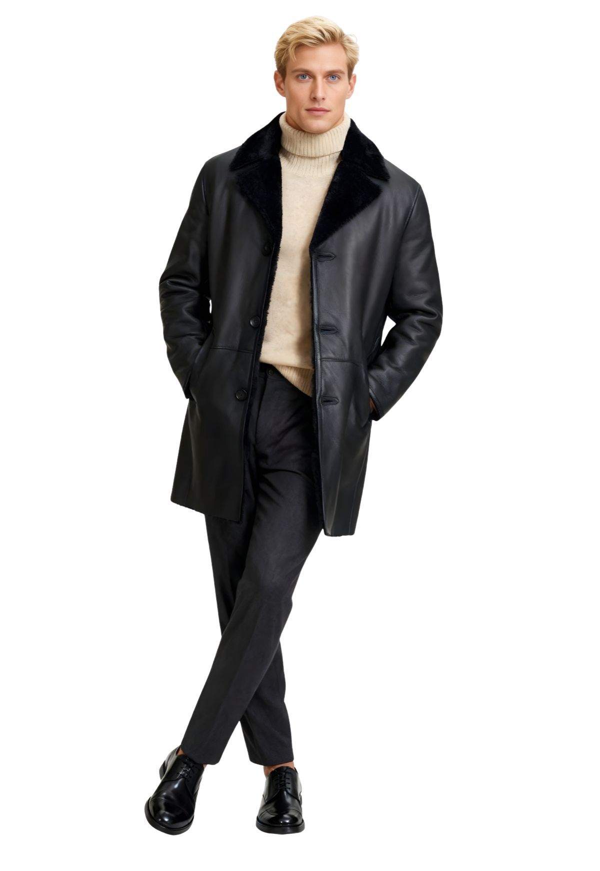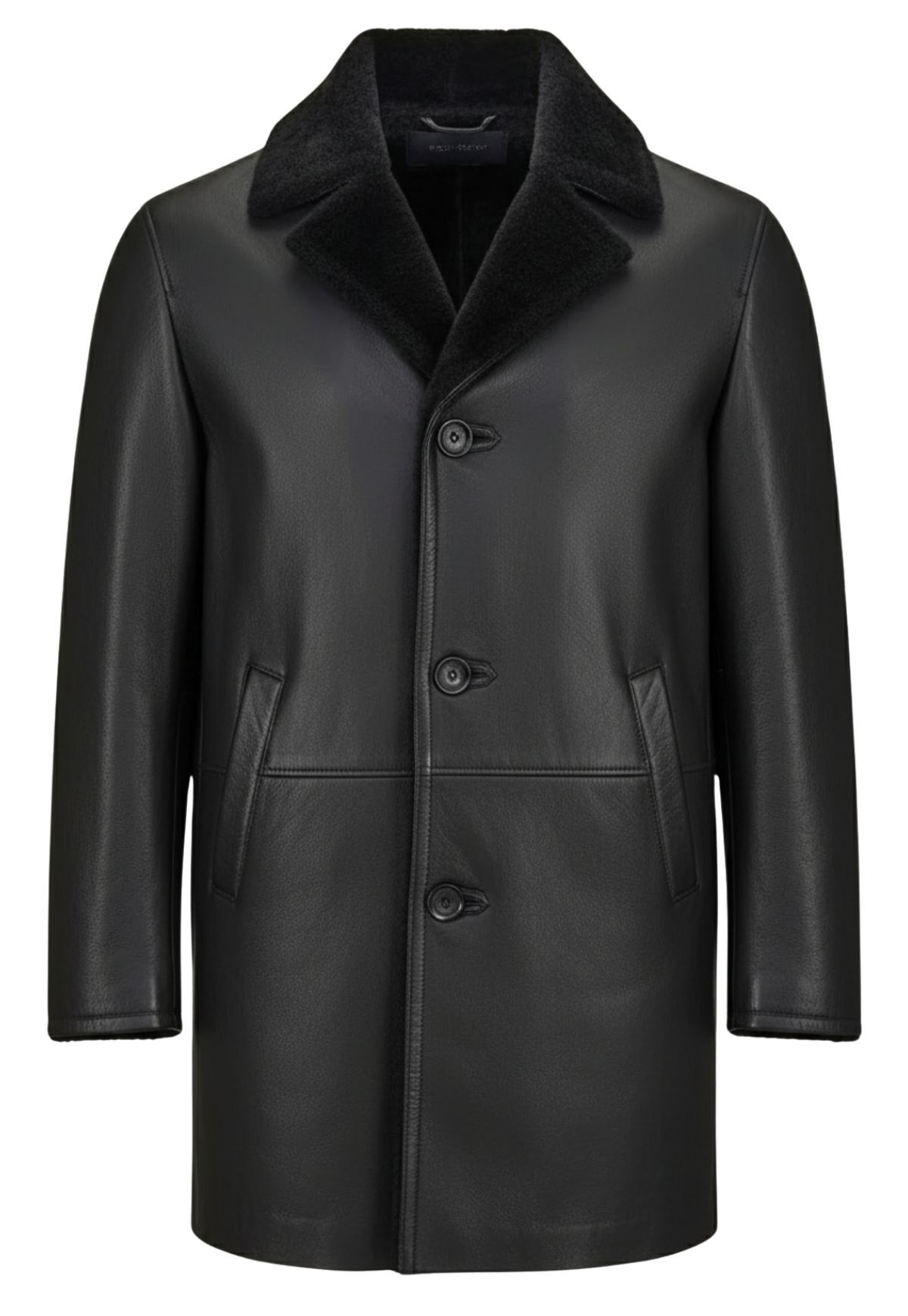 Der elegante Reverskragen betont die hochwertige Lammfell-Qualität und verleiht dem Mantel eine stilvolle Note. Mit seiner klassischen Schnittführung, den vier Knöpfen zum Verschließen und zwei praktischen Seitentaschen vereint der Lammfellmantel Sten Funktionalität und modischen Anspruch auf ideale Weise.