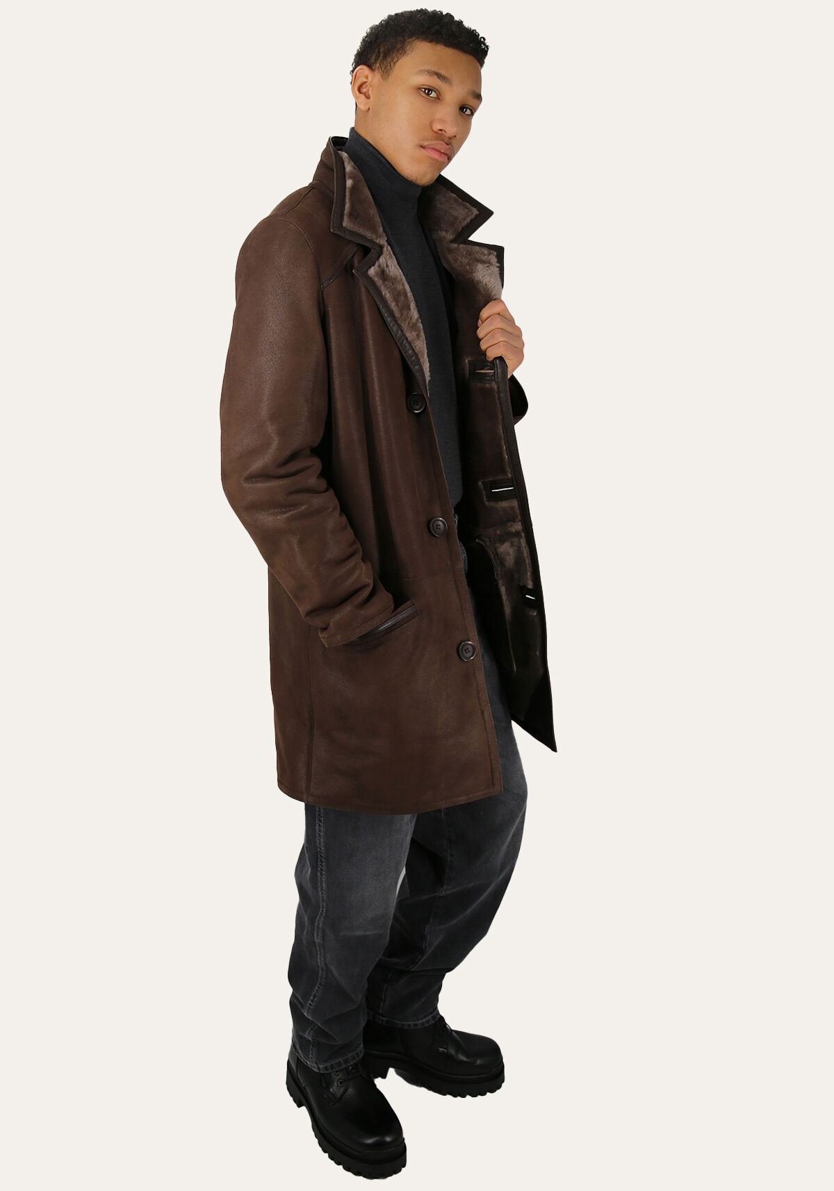 Dank der eleganten braunen Lederfarbe lässt sich der Mantel mühelos mit jeder Farbnuance kombinieren, was ihn zu einem vielseitigen Kleidungsstück für verschiedene Anlässe macht.