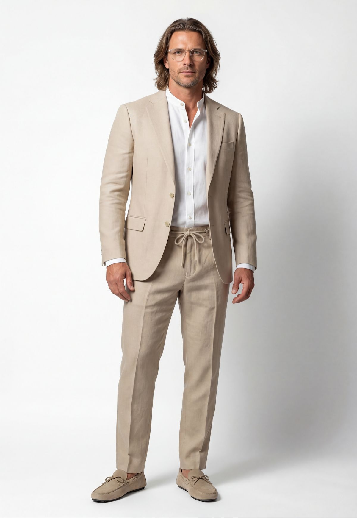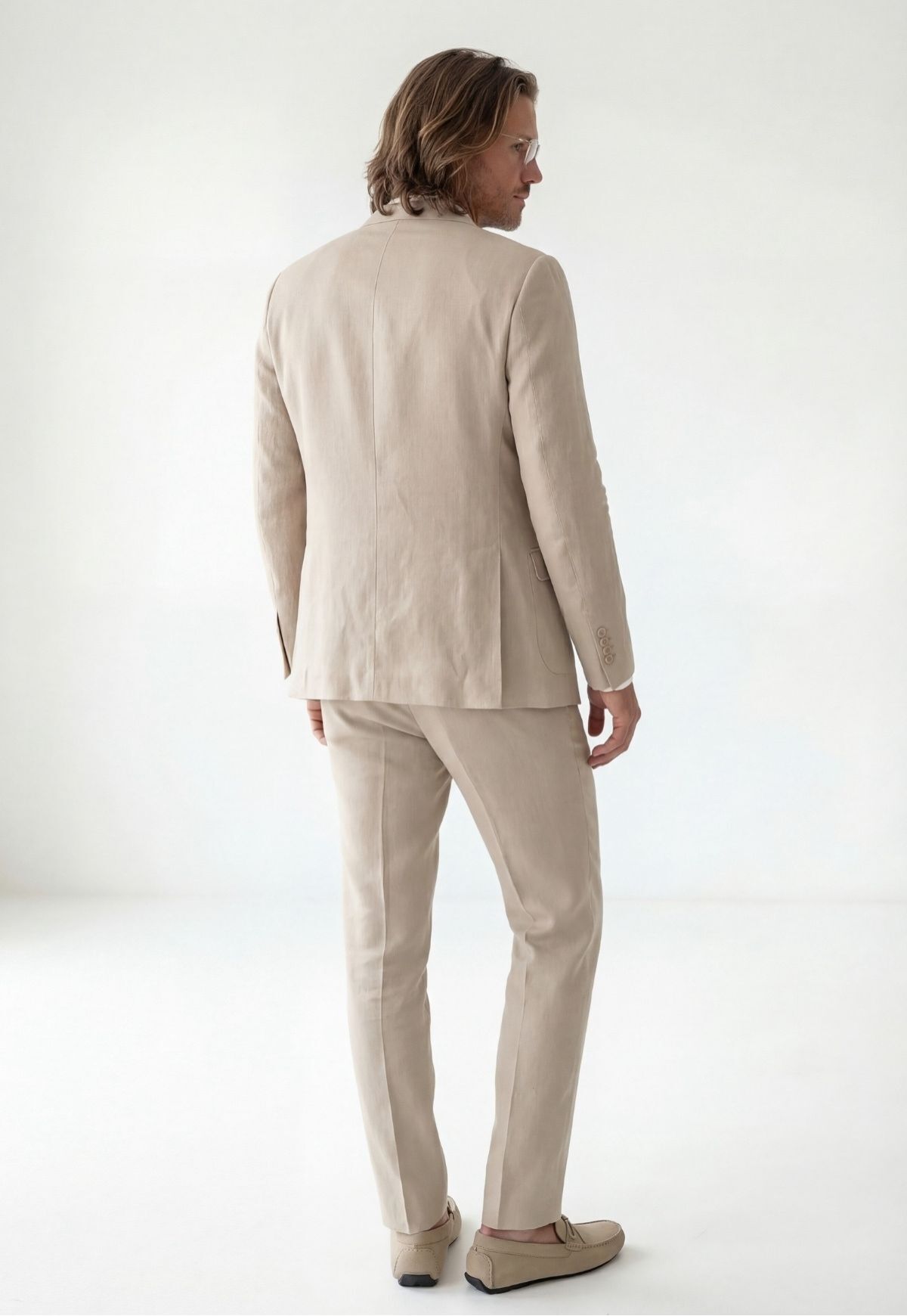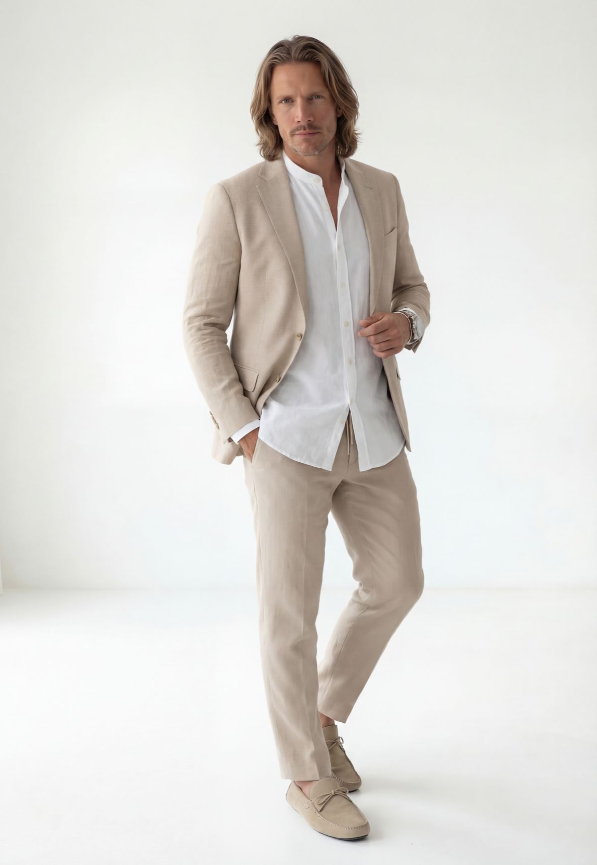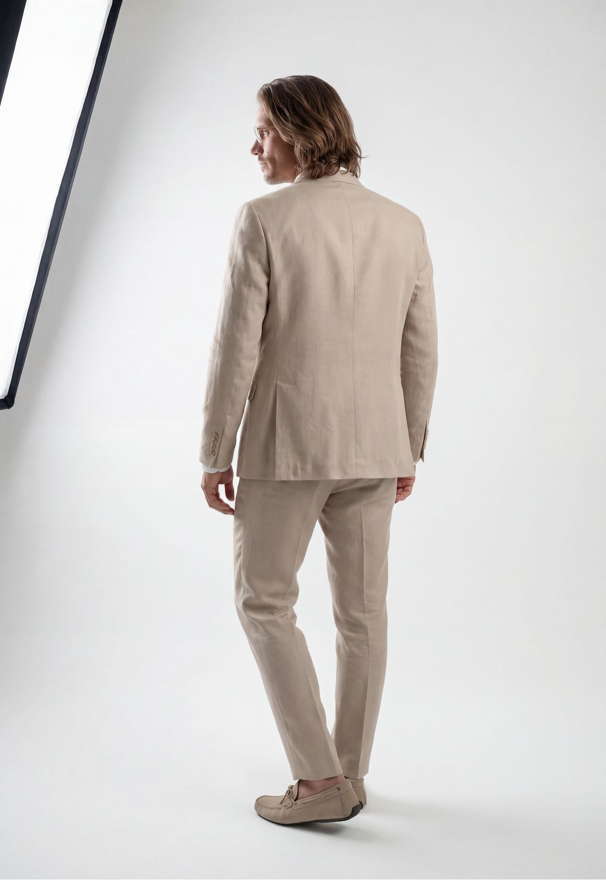 Das hochwertige Naturleinen ist besonders atmungsaktiv, temperaturregulierend und angenehm leicht – ideal für warme Tage und stilvolle Auftritte. Der moderne, leicht taillierte Schnitt sorgt für eine schlanke Silhouette, während klassische Details wie das fallende Revers, die dezenten Pattentaschen und die hochwertige Knopfleiste den eleganten Anspruch betonen.
