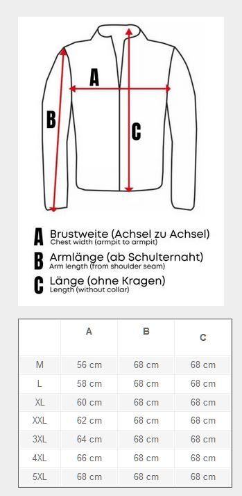 C M 56 cm 68 cm 68 cm L 58 cm 68 cm 68 cm XL 60 cm 68 cm 68 cm XXL 62 cm 68 cm 68 cm 3XL 64 cm 68 cm 68 cm 4XL 66 cm 68 cm 68 cm 5XL 68 cm 68 cm 68 cm