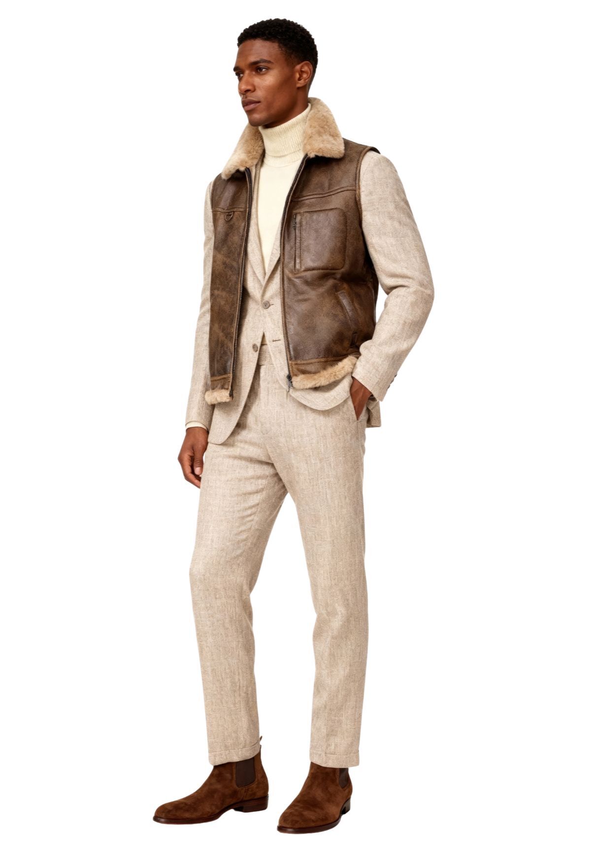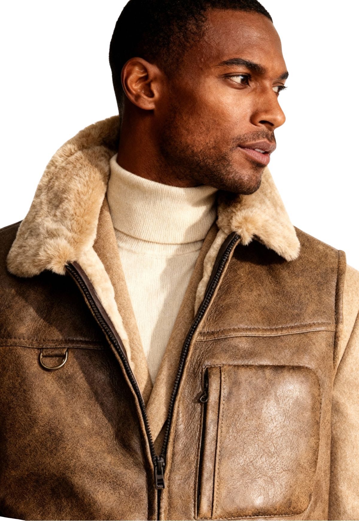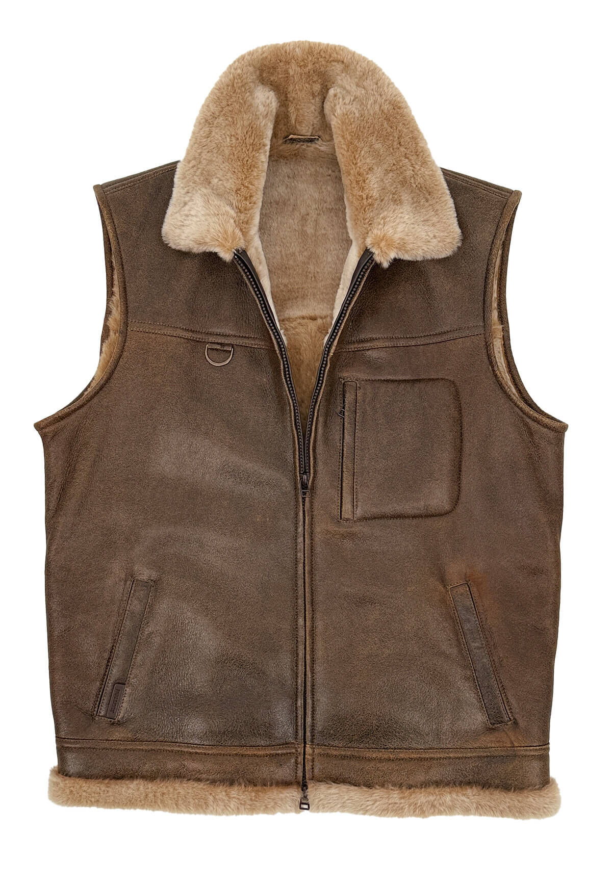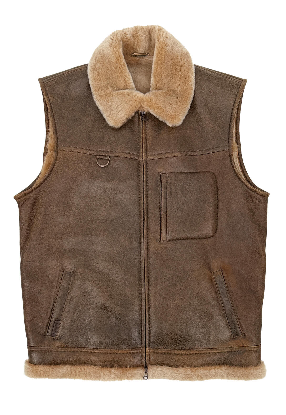 - Vest has a two-way zipper, two side pockets, a pelt collar and one upper pocket with a zipper.