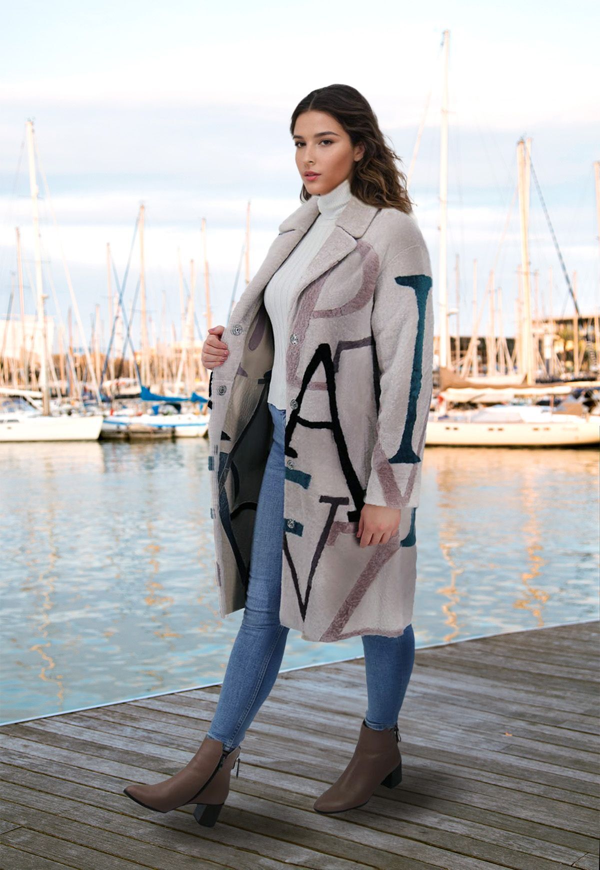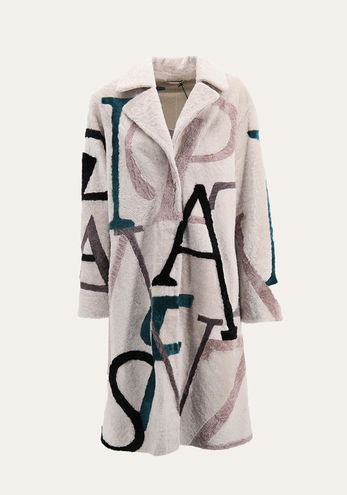 - Contrasting pattern of letters makes it stand out from other sheepskin coats.