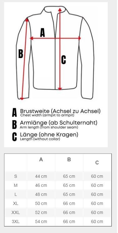 C S 44 cm 65 cm 60 cm M 46 cm 65 cm 60 cm L 48 cm 65 cm 60 cm XL 50 cm 66 cm 60 cm XXL 52 cm 66 cm 60 cm 3XL 54 cm 66 cm 60 cm EigenschaftenVerschluss Reißverschluss Saison Frühjahr/Sommer Farbe Schwarz Obermaterial Nappaleder Innenfutter Polyester