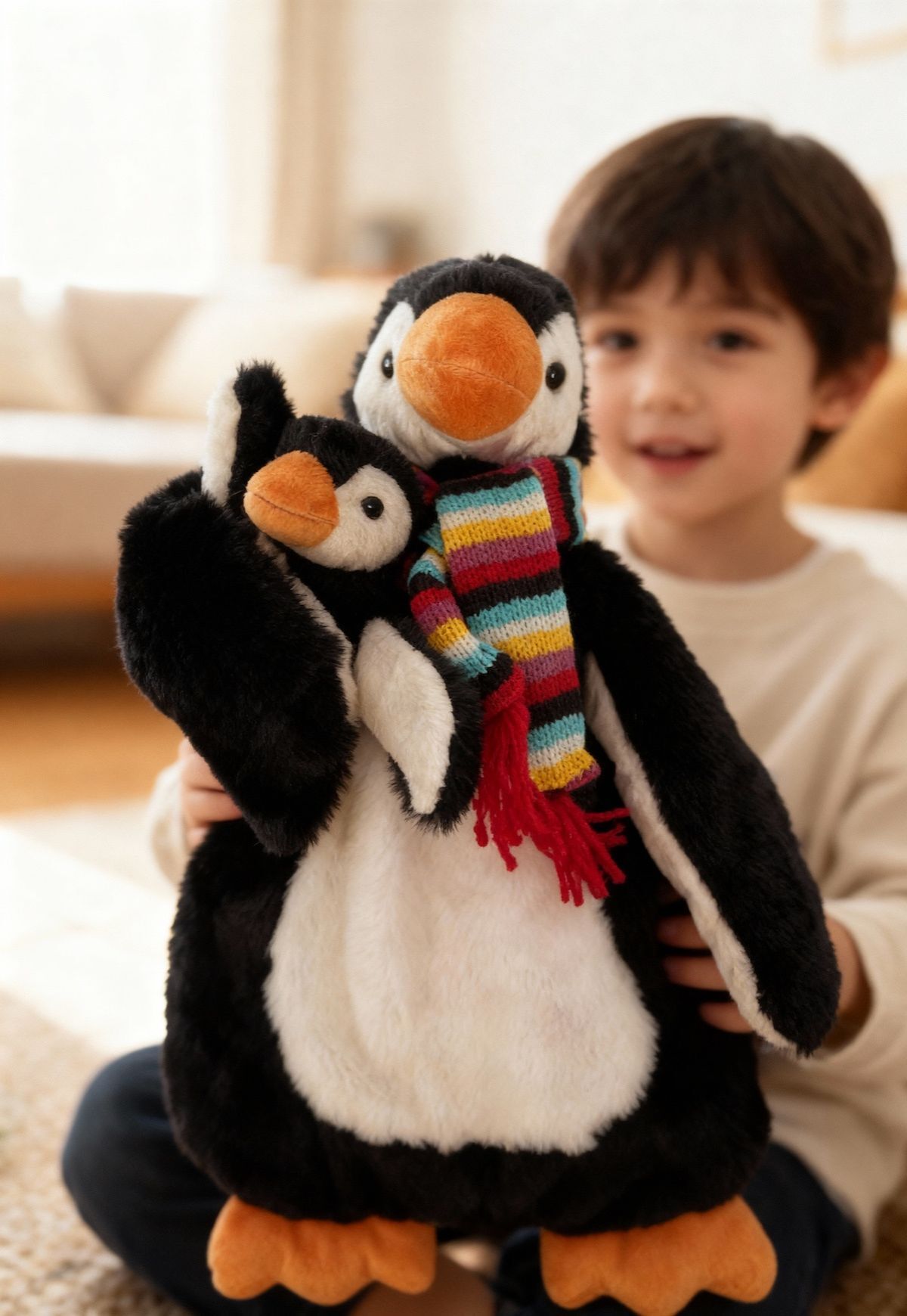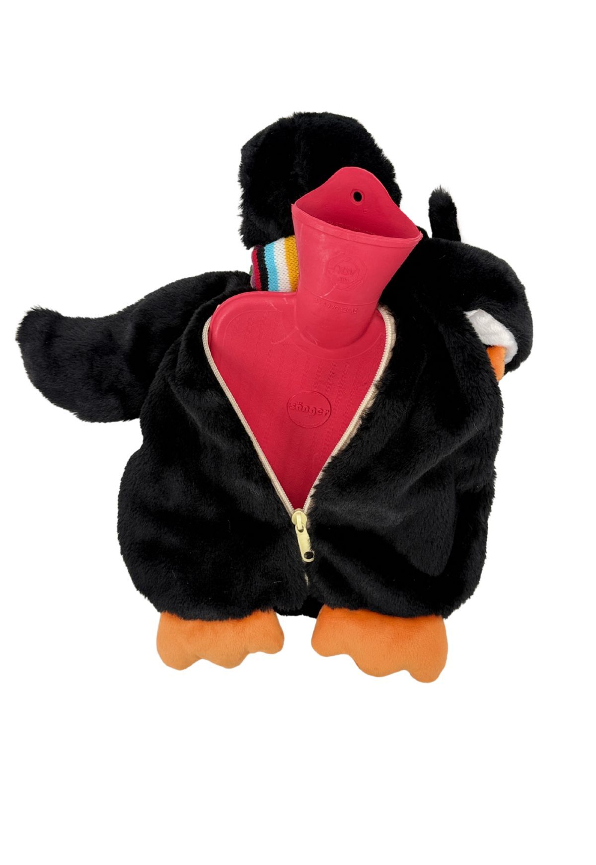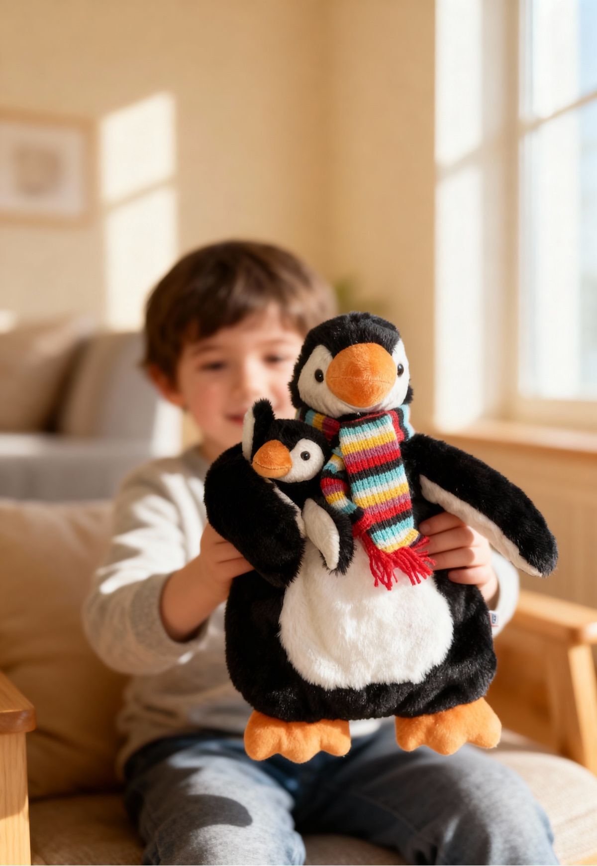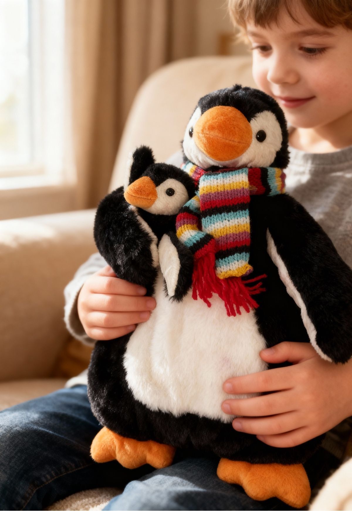 Die flauschigen Plüschbezüge von Mama/Papa Pinguin sind angenehm weich und mit einem langen, hochwertigen Reißverschluss am Rücken versehen, sodass die Wärmflasche einfach entnommen und befüllt werden kann. Das Baby Jamie ist mit einem weichen Klettverschluss am Arm befestigt und kann jederzeit abgenommen werden – ideal zum Spielen und Liebhaben.