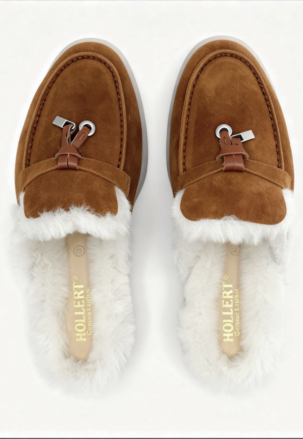 Die Fiorana Lammfell-Mules vereinen schlichte Raffinesse mit unvergleichlichem Komfort. Gefertigt aus feinem Veloursleder im warmen Kastanien-Ton und gefüttert mit flauschigem, naturweißem Lammfell, schenken sie ein außergewöhnlich weiches Tragegefühl und eine wohlige Wärme.
