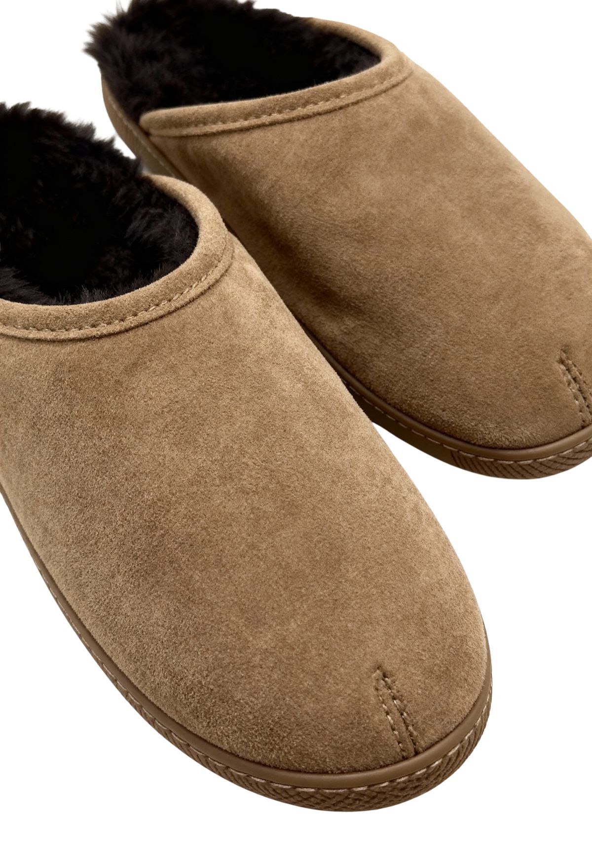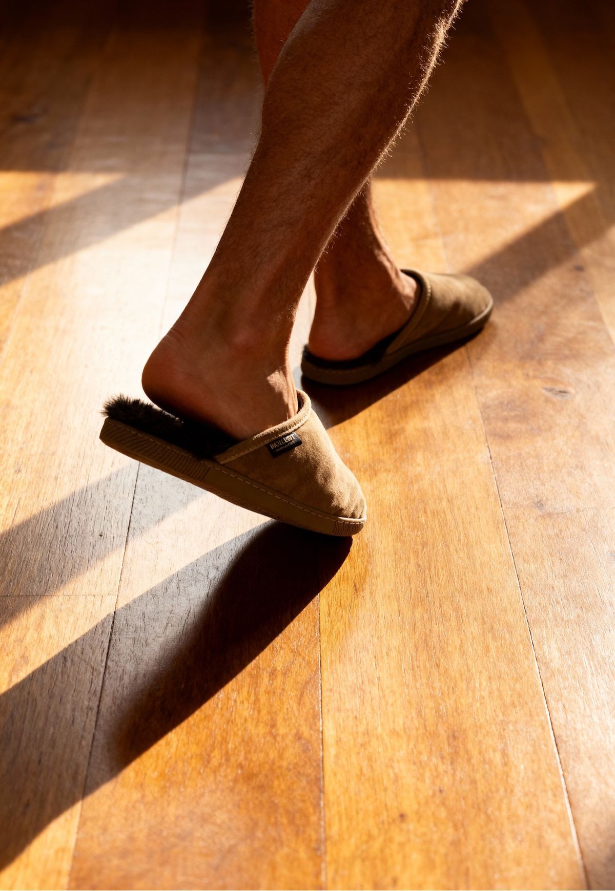 Die Pantoffeln sind aus Veloursleder in einem eleganten Beigeton gefertigt. Dieses Material verleiht den Pantoffel nicht nur eine ansprechende Optik, sondern ist auch äußerst strapazierfähig.