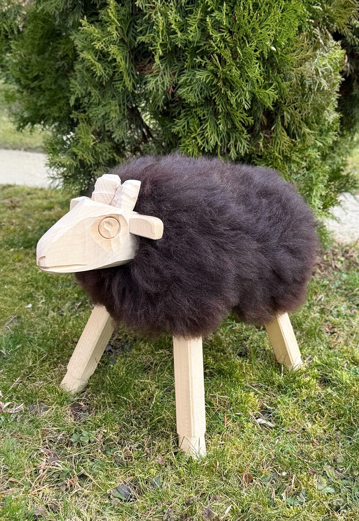 • Freches Schäfchen aus Massivholz und kuscheligem Lammfell in Braun