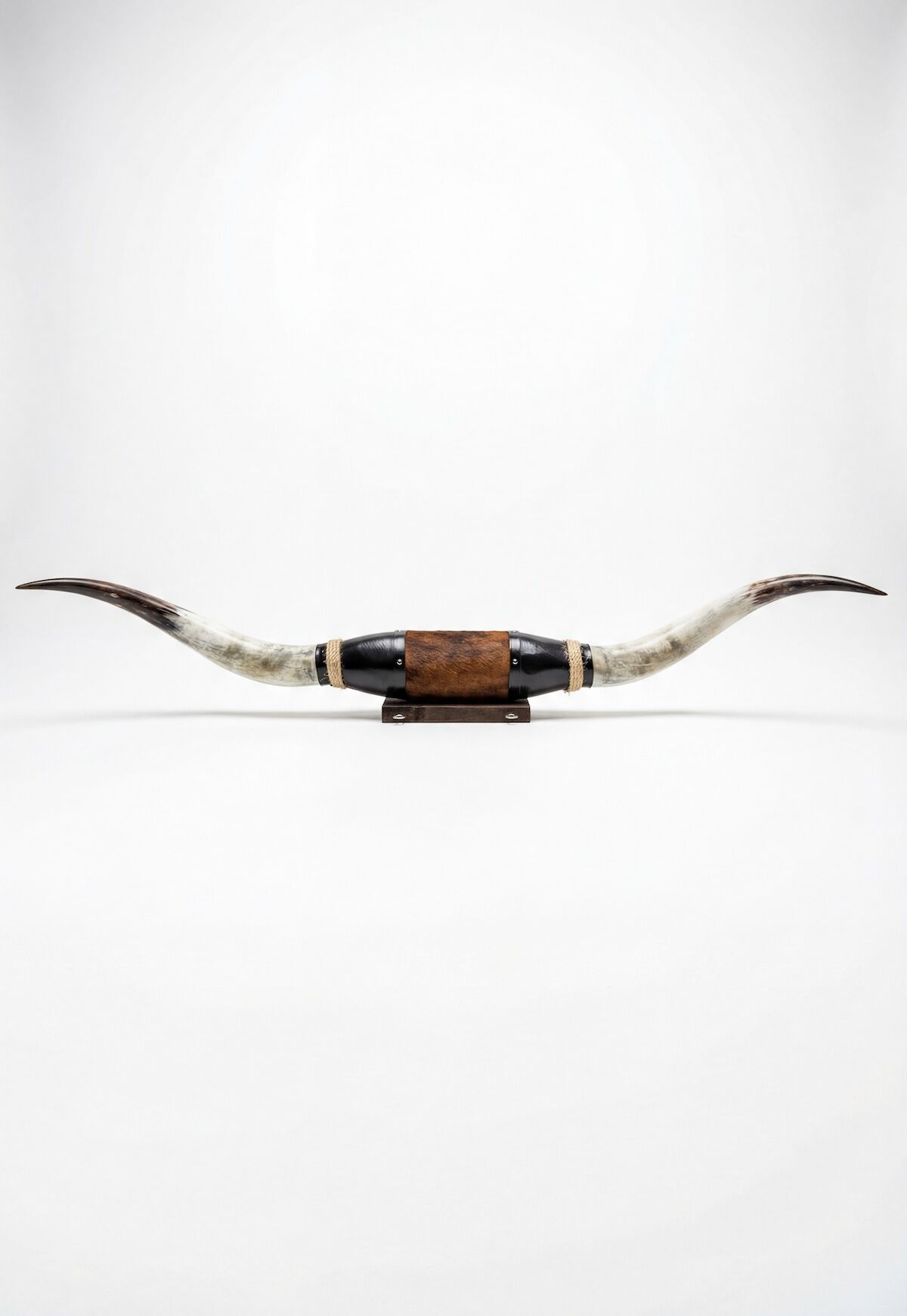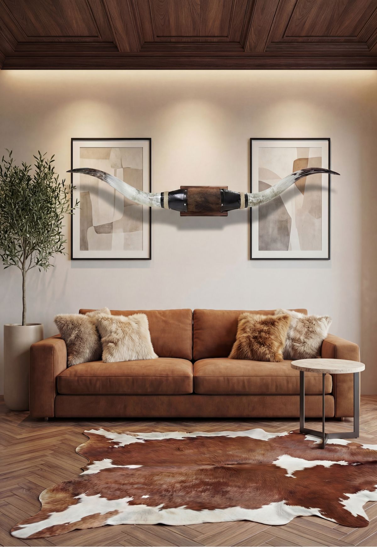 Mit einer imposanten Länge von ca. 150 cm setzt dieses Longhorn-Wandobjekt ein kraftvolles Zeichen für Stil, Individualität und natürliche Eleganz. Die harmonisch geschwungenen Hörner in edlen Naturtönen treffen auf ein hochwertiges Mittelstück aus dunklem Holz mit Lederakzent – eine Kombination aus Ursprünglichkeit und modernem Interior-Design.