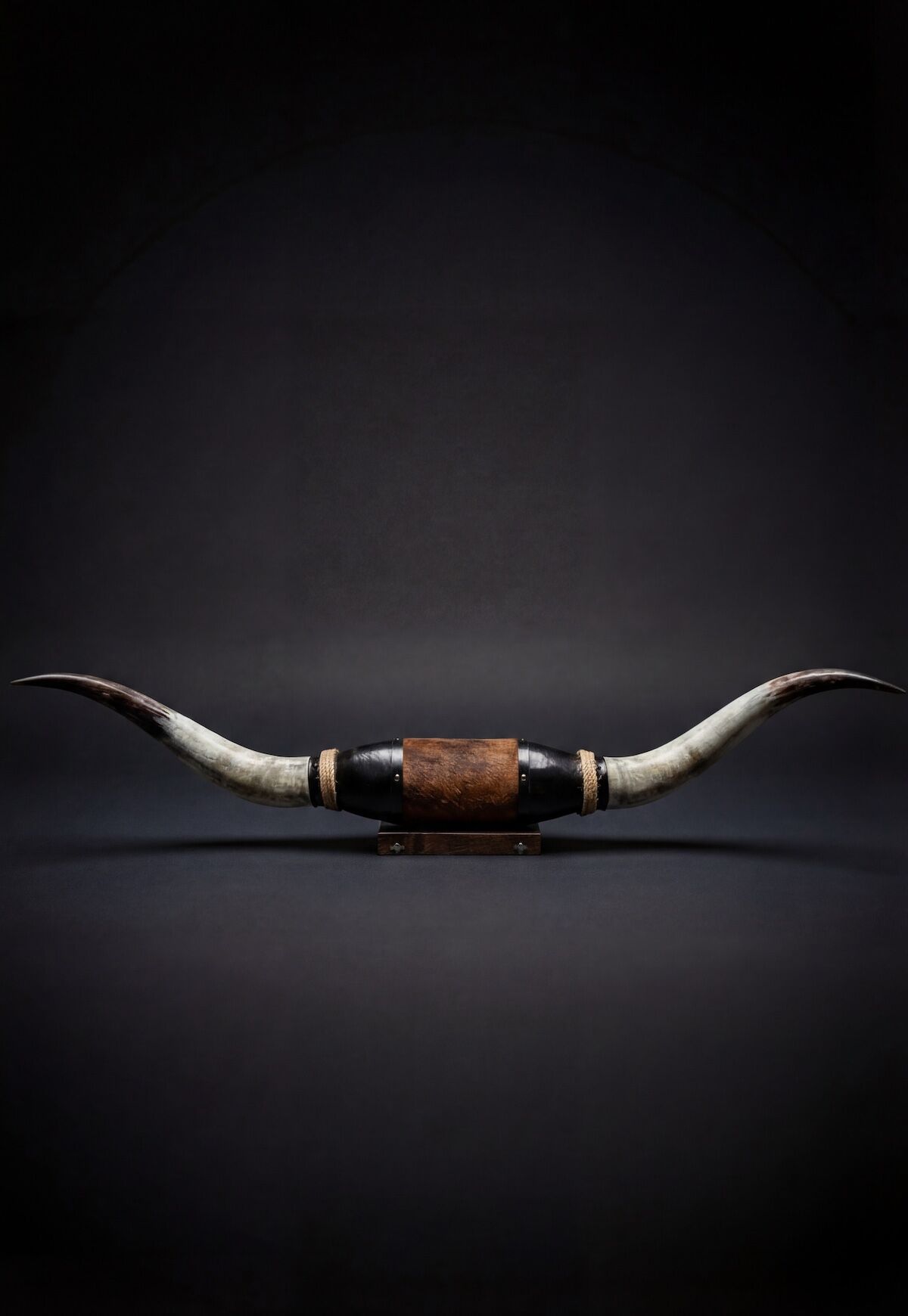 Longhorn Wandobjekt Modell 1 – Naturhorn Einzelstück mit Leder- & Holzhalterung